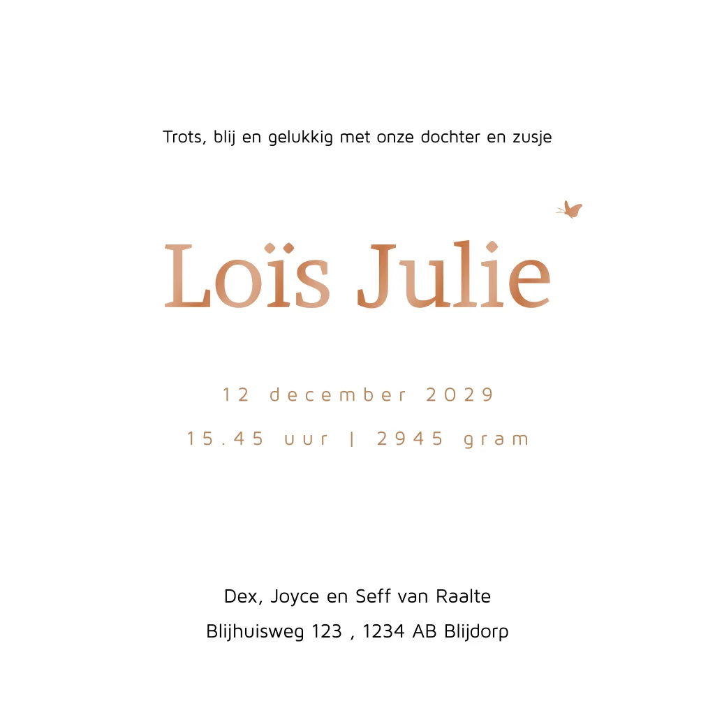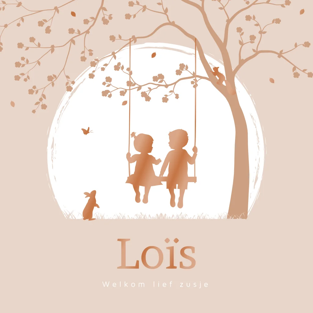 Silhouet geboortekaartje met een grote broer en een klein zusje samen op een schommel, onder een boom met eekhoorntje erin. Een haasje kijkt naar ze op. Op dit kaartje Loïs zijn trendy kleuren gebruikt die helemaal hip zijn! Deze kaart voor een tweede kindje is voorzien van hoogglans, wat de kaart super exclusief maakt. De kleur van hoogglans kun je in de ontwerpmodule aanpassen. Vragen of speciale wensen? Laat het ons weten!