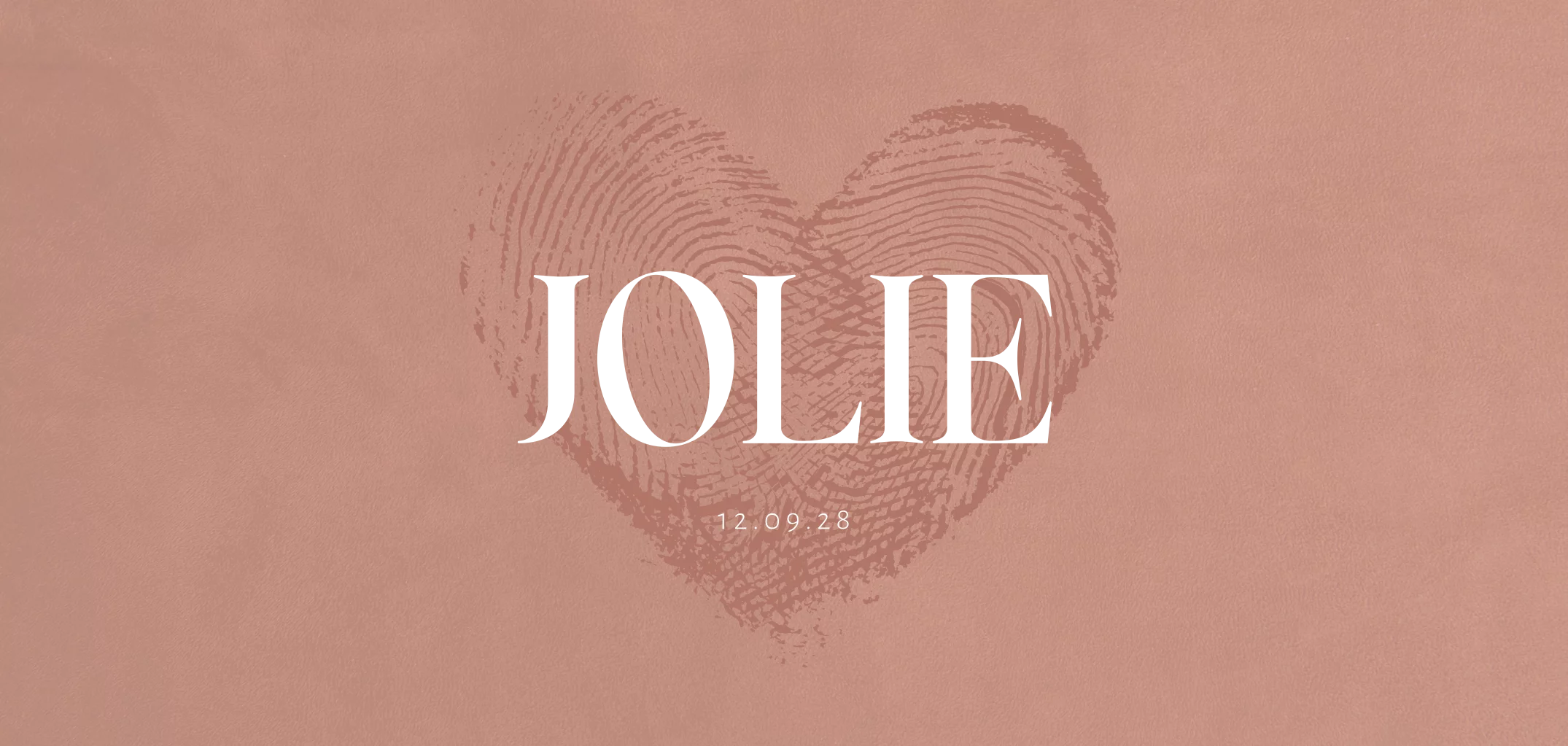 Een mooi roze geboortekaartje voor een meisje geïnspireerd op het fingerprint geboortekaartje Maas van Anne Vedder. Op het kaartje zie je een roze suèdelook als achtergrond met twee vingerafdrukken in de vorm van een hartje. Op het hartje is de babynaam vormgegeven in roségoud foliedruk. Dit geeft een extra luxe uitstraling aan dit geboortekaartje Jolie. Het geboortekaartje kun je naar eigen wens aanpassen in de online editor.