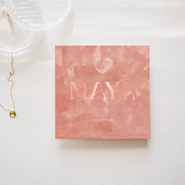 Dit geboortekaartje Maya met een vingerafdruk hartje is een prachtige keuze voor ouders die op zoek zijn naar een stijlvolle en unieke manier om de geboorte van hun dochter aan te kondigen. De naam is in roségoud foliedruk vormgegeven. Foliedruk geeft het geboortekaartje een extra luxe uitstraling. De achtergrond van het kaartje heeft een betonlook. Dit fingerprint geboortekaartje is naar eigen wens aan te passen in de online editor.