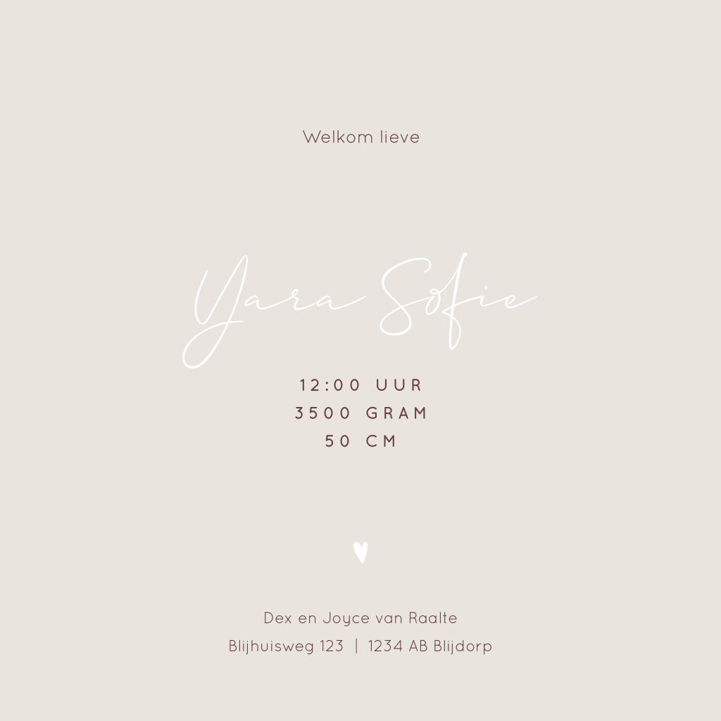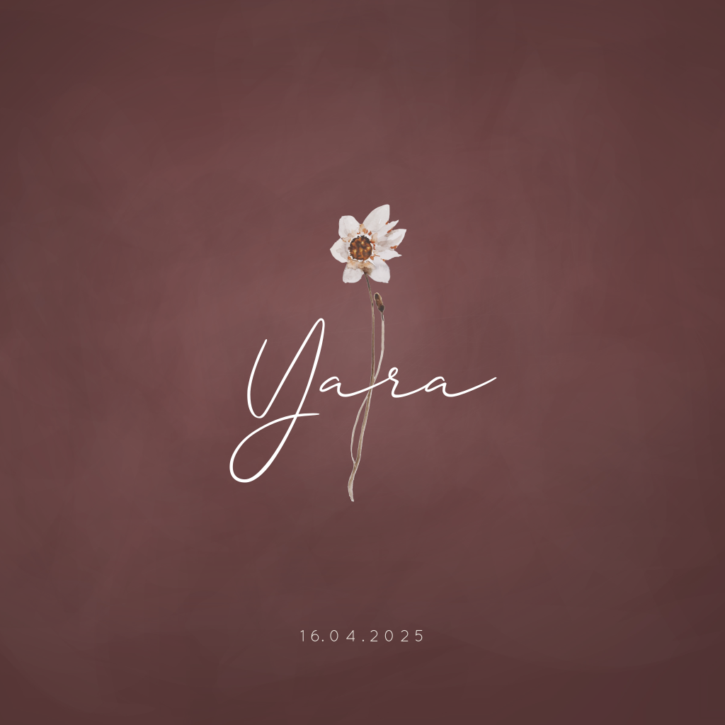 Een geboortekaartje voor een meisje met echt foliedruk. Dit babykaartje heeft de naam Yara in goudfolie, hierdoor komt de naam extra mooi naar voren. De bloem aan de voorkant van de kaart komt ook aan de binnenzijde terug. De teksten en lettertypes zijn in onze editor naar eigen smaak aan te passen. Folie is mogelijk in de volgende kleuren: goud, zilver, zwart, koper of roséfolie. Hulp nodig bij het ontwerpen? Wij helpen je graag verder.