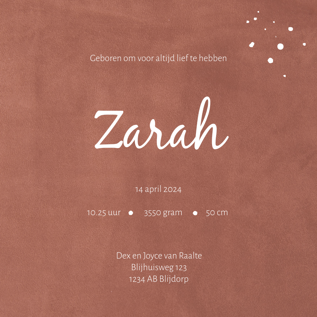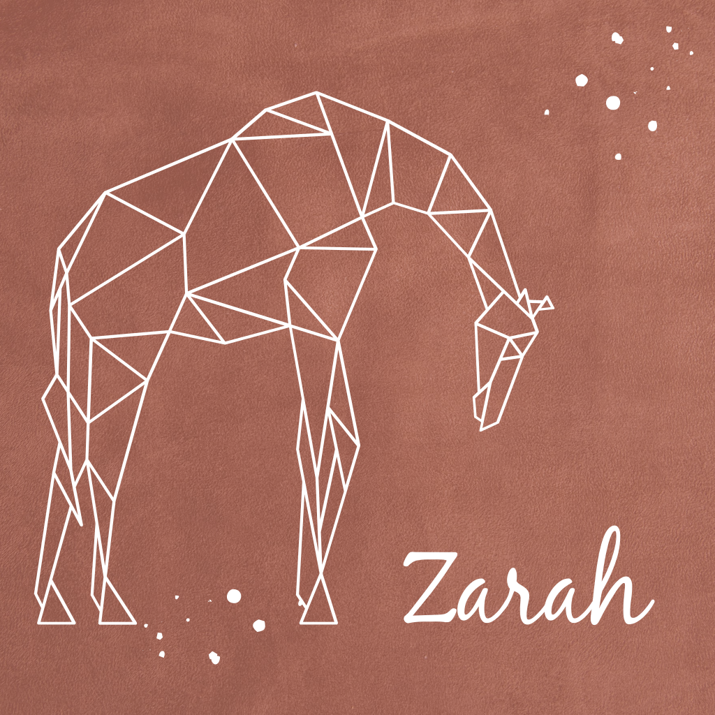 Stoer geboortekaartje voor een meisje met een geometrische giraffe. Op dit kaartje Zarah worden de roségouden elementen die je ziet op de kaart gedrukt met echt roséfolie. Dit geeft de kaart een luxe uitstraling. De roséfolie is een mooie kleurencombinatie met de roestbruine achtergrond. De kleur van de foliebedrukking kun je in de ontwerpmodule aanpassen. Net als de teksten en lettertypes. Vragen? Laat het ons gerust weten. We staan voor je klaar.