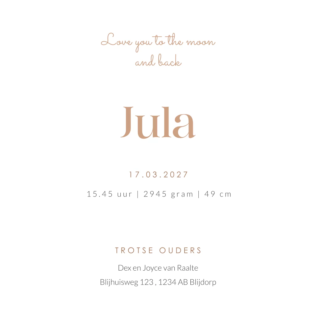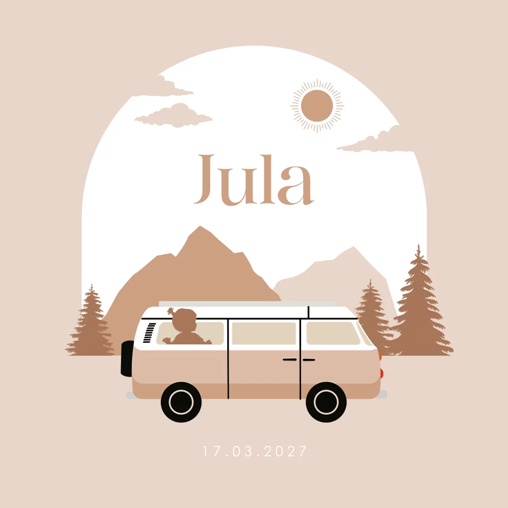 Dit unieke geboortekaartje Jula is perfect voor meisjes. Het silhouet van een meisje zit in een retro camper busje. Rijdend door de bergen en bomen, op avontuur! Pas de teksten, kleuren en lettertypes naar je eigen smaak aan in de editor. Ook mogelijk in een andere gezinssamenstelling.