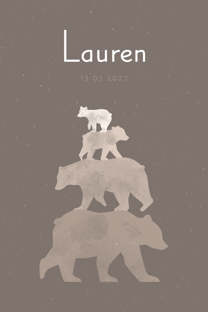 Hip genderneutraal geboortekaartje met gestapelde beren. De naam van jullie zoon of dochter wordt gedrukt in écht roséfolie. De ronde hoeken en het lichte papiermotief geven dit babykaartje Lauren een speels effect. Pas het kaartje naar je eigen smaak aan in de editor, ook mogelijk met andere kleuren folie.