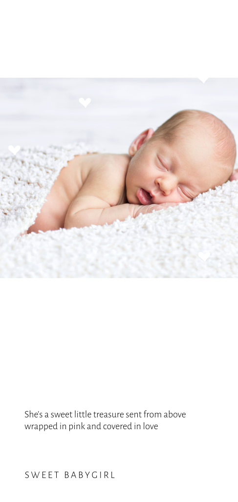 Een lief en exclusief geboortekaartje voor een meisje met eigen foto. De gouden elementen op de kaart, waaronder de babynaam en de hartjes, worden gedrukt in echt goudfolie. Dit maakt de kaart extra speciaal. De kleur van de folie is gemakkelijk aan te passen in de editor naar zilverfolie, koperfolie of roséfolie.