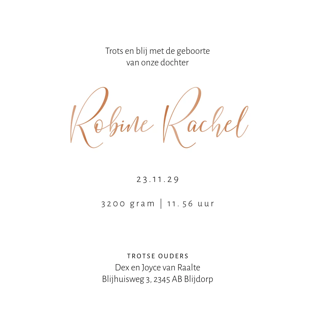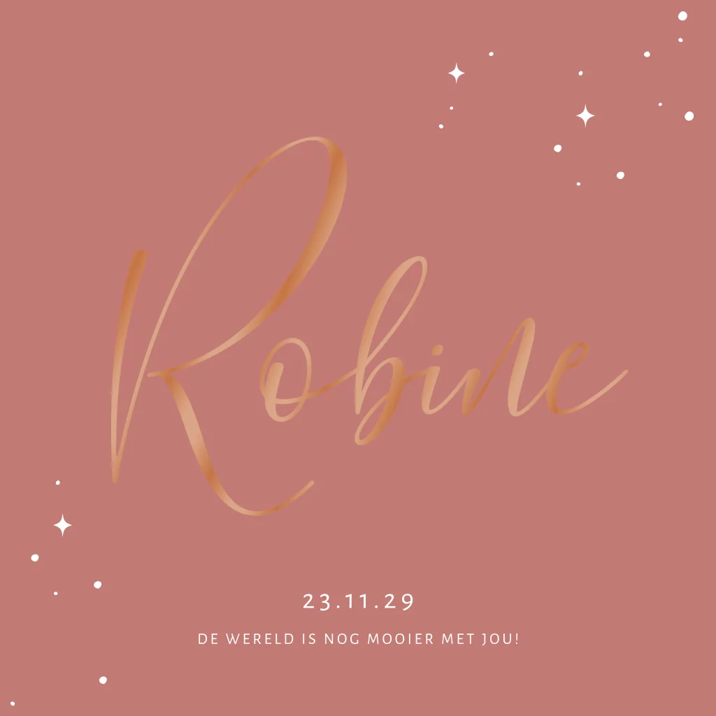 Hip geboortekaartje voor een meisje met hoogglans en kleine sterretjes. Dit kaartje Robine heeft een basic design, maar doordat de koperen elementen gedrukt worden in echt hoogglans, krijgt de kaart een luxe uitstraling. Je kunt de kleur eenvoudig aanpassen naar goudfolie, zilverfolie of roséfolie.