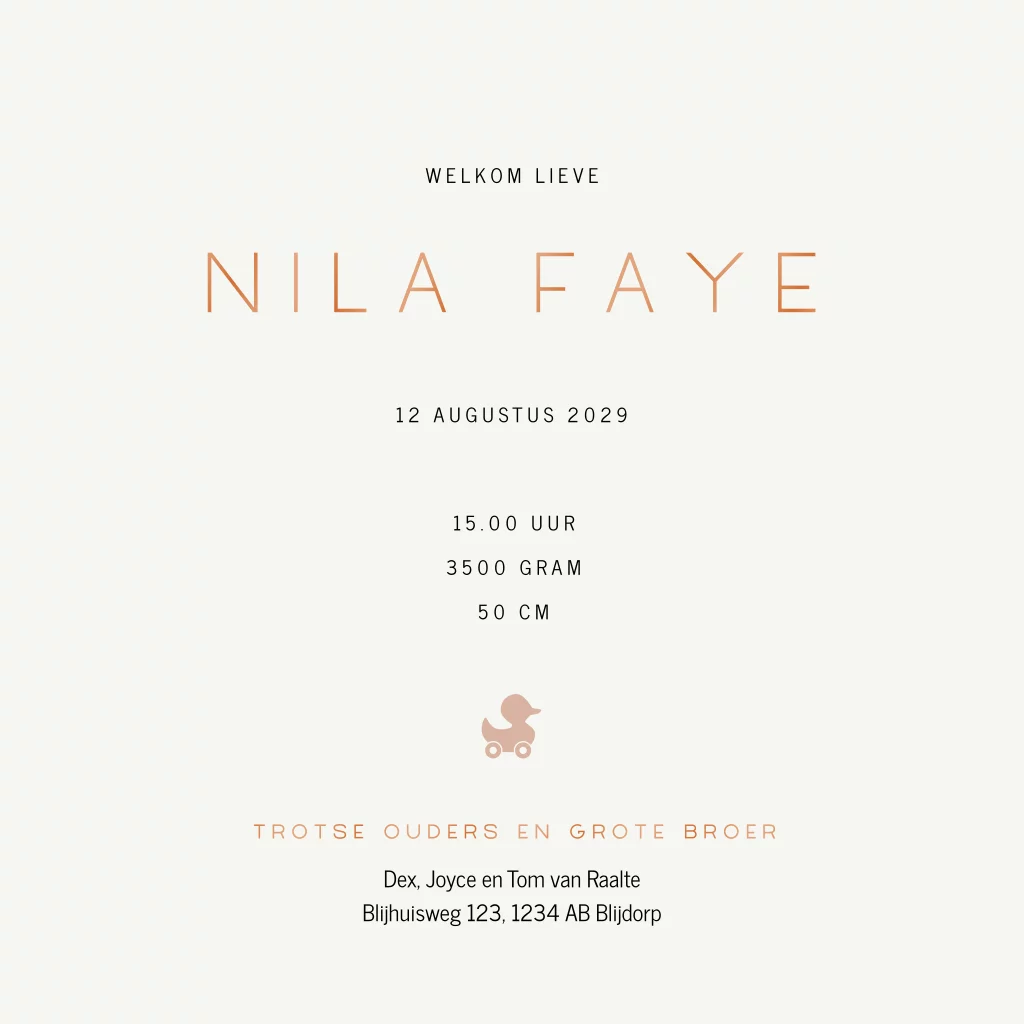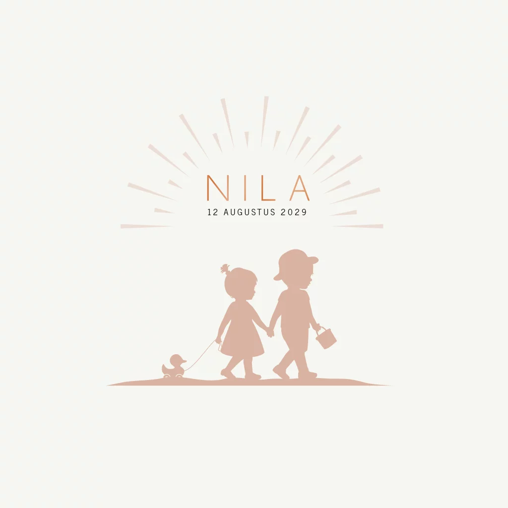 Lief zomers geboortekaartje met het silhouet van een grote broer samen met een klein zusje. De grote broer draagt een zomerhoedje en heeft emmertje in zijn hand. Het kleine zusje loopt met een trek- eendje. De babynaam wordt gedrukt in hoogglans. Hoogglans heeft een mooie glans en dit geeft je kaartje een luxe uitstraling. De zonnestralen geven een leuk effect. Pas dit kaartje Nila naar je eigen smaak aan in de editor. Ook mogelijk met goudfolie, roséfolie of zilverfolie.