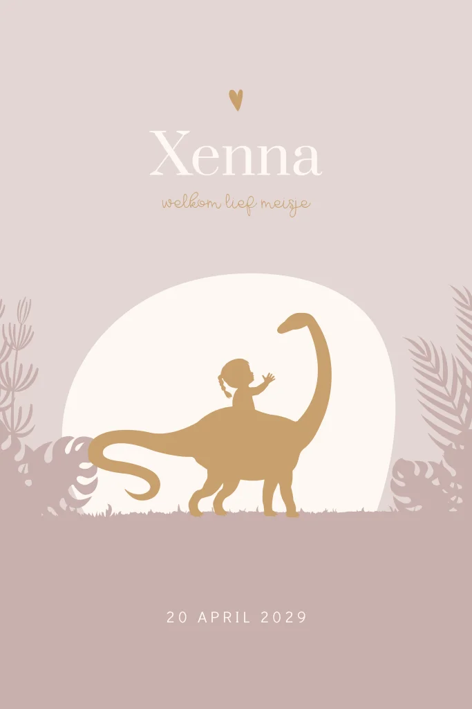 Ouders geworden van een prachtige dochter? Stuur dit geweldige meisjes geboortekaartje naar al je bekenden. Op dit silhouet kaartje Xenna een silhouet van een meisje rijdend op de rug van een dinosaurus. Op de achtergrond botanische bladeren met ondergaande zon. Pas het kaartje naar je eigen smaak aan in de editor. Ook mogelijk voor een andere gezinssamenstelling.