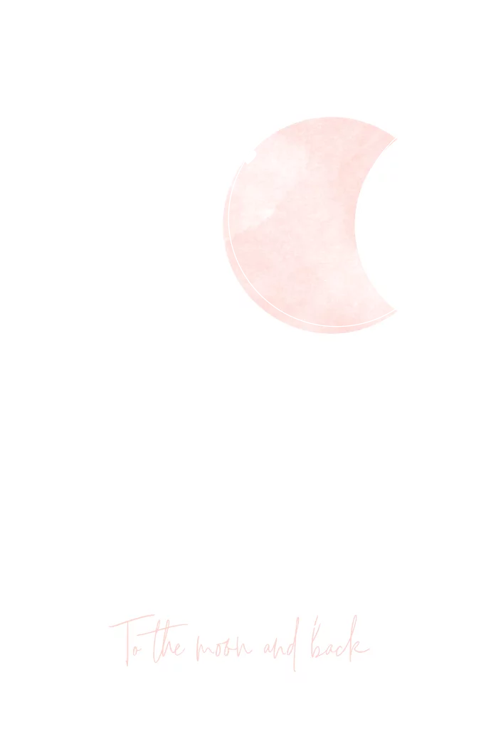 To the moon and back! Lief geboortekaartje voor een dochter. Op dit kaartje Noortje staat een aquarel maan in de kleur pastelroze. Daar omheen een mooi lijntje en kleine hartjes in roséfolie. Ook de naam wordt gedrukt in echt roséfolie. Dit geeft de kaart een exclusieve uitstraling. Verder is de kaart overwegend wit en oogt daardoor rustig. De kleuren zijn aan te passen in de editor. Ook mogelijk met goudfolie, zilverfolie.