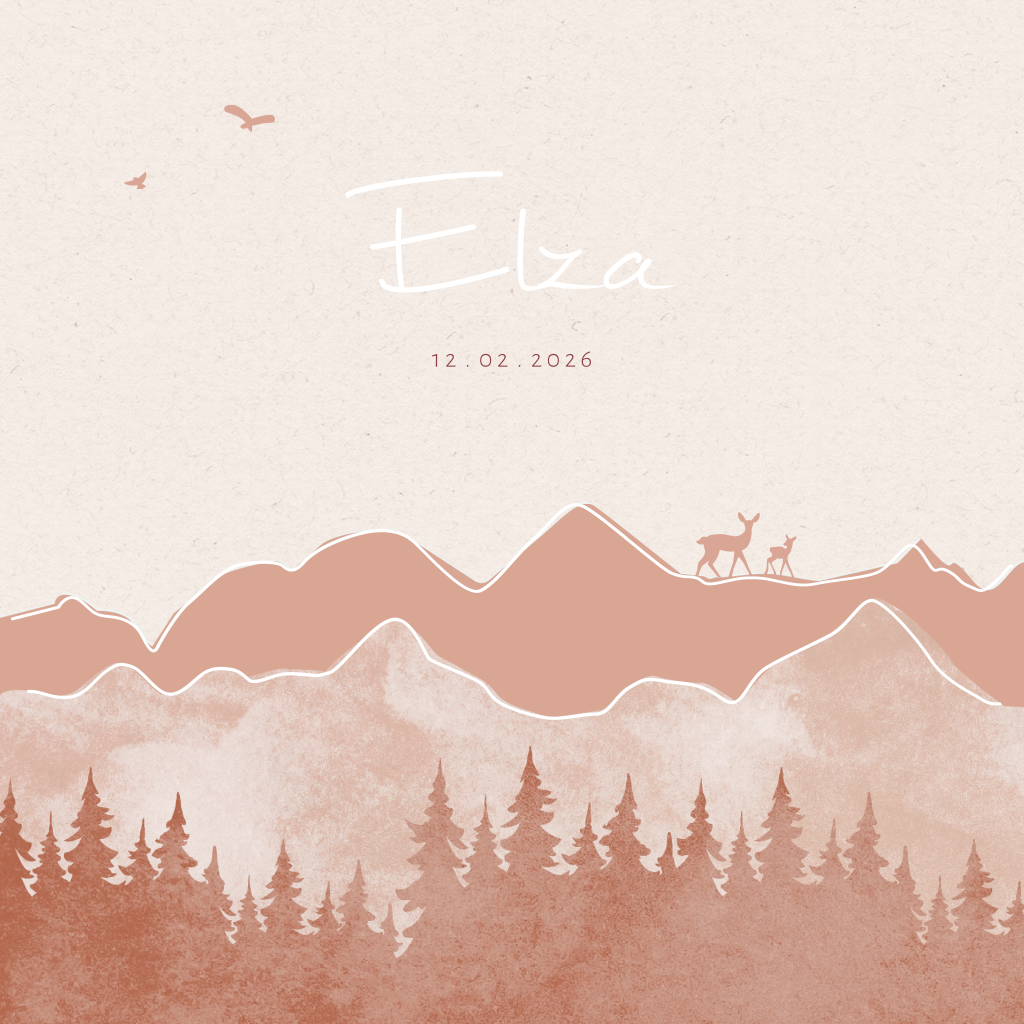 Verwachten jullie in de winter jullie eerste kindje en zijn jullie als ouders gek van (hiken in) de bergen en het bos? Dan is dit prachtige geboortekaartje helemaal geschikt! Op dit babykaartje Elza een roze ton-sur-ton berglandschap met hoog in de bergen hertjes en vogels. De naam van jullie dochter wordt gedrukt in écht rosé goudfolie, dat geeft dit kaartje een extra luxe uitstraling.