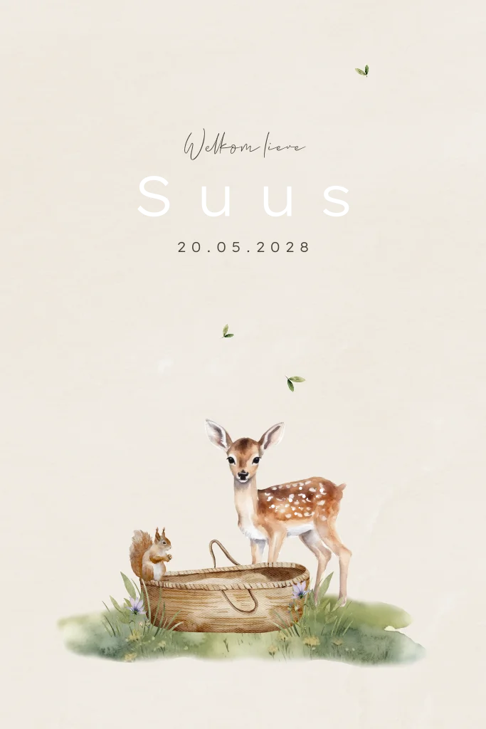 Lief geboortekaartje voor een meisje met een aquarel tekening van bosdieren. Je ziet op dit geboortekaartje Suus een hertje en eekhoorn bij een baby mandje. Het tafereeltje geeft een lieve indruk. De dubbelzijdige goudfolie en ronde hoeken geven het kaartje een extra luxe touch. Pas de teksten, lettertypes en kleuren eenvoudig aan in de editor. Hulp nodig bij het ontwerpen? Neem contact met ons op!