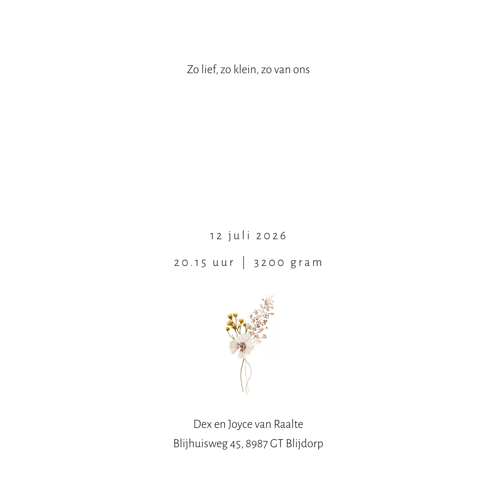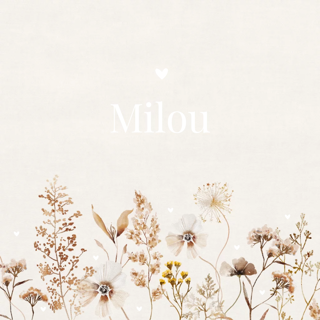 Romantisch geboortekaartje voor een meisje met mooie aquarel veldbloemen en een lichte linnen achtergrond. Helemaal de trend van nu! De babynaam en het kleine hartje op de voor- en achterzijde worden gedrukt in écht goudfolie. De folie heeft een mooie glans en geeft de kaart een exclusieve en chique uitstraling. De teksten en lettertypes van dit babykaartje Milou zijn aan te passen in de editor. De kleur van de folie kun je wijzigen naar roséfolie, koperfolie, zilverfolie of zwartfolie.