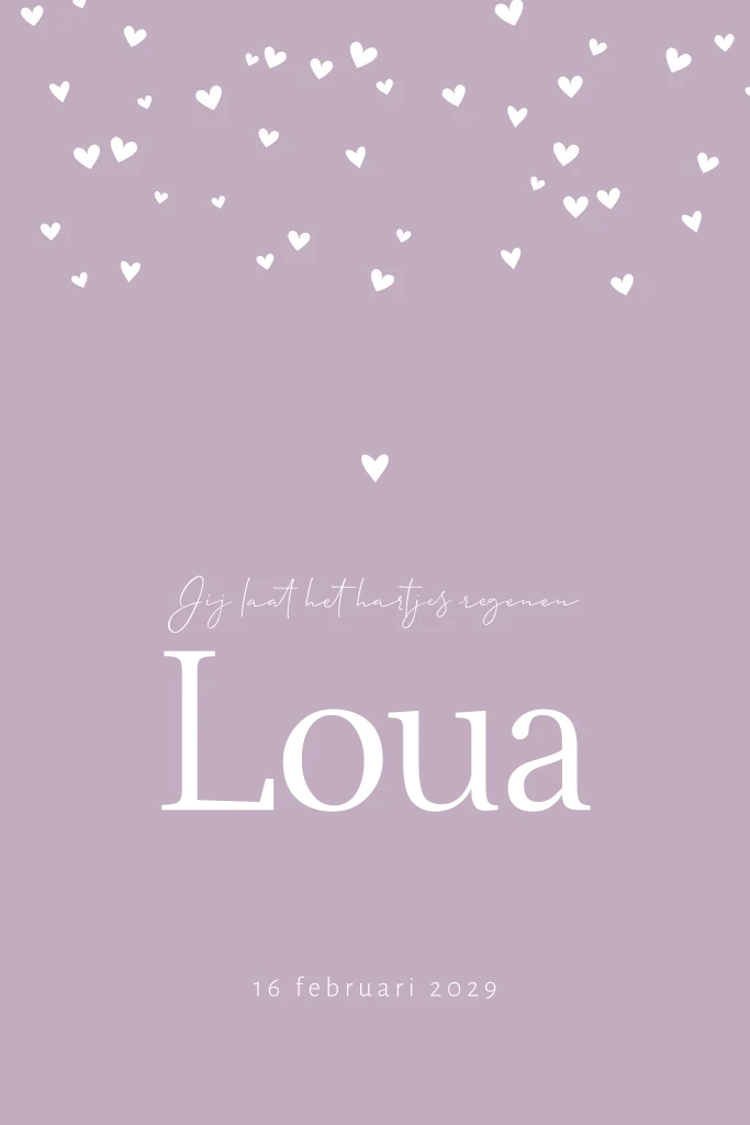 Trendy geboortekaartje voor een meisje met vallende hartjes en de bijpassende tekst 'Jij laat het hartjes regenen'. Dit meisjeskaartje met de naam Loua, heeft een trendy paars lila achtergrond. De babynaam en enkele hartjes worden gedrukt in écht goudfolie. Foliedruk zorgt voor een luxe uitstraling en maakt dit kaartje extra speciaal. In onze editor kun je de kleur van de folie makkelijk wijzigen naar koperfolie, zilverfolie, roséfolie of zwartfolie.