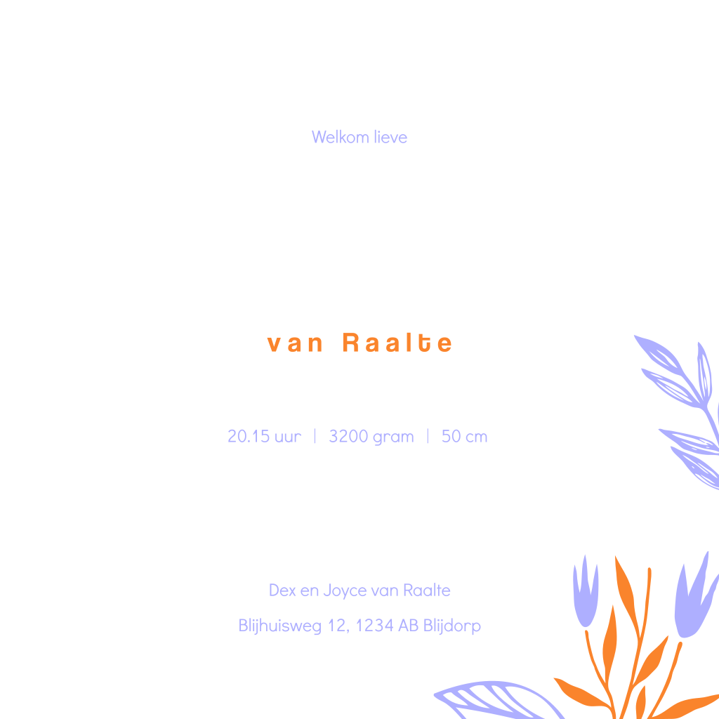 Geweldig color geboortekaartje voor een meisje. Op de achtergrond een lila paarse tint met kleurrijke bloemen in verschillende felle kleuren. De gouden elementen worden gedrukt in echt goudfolie. De folie heeft een mooie glans en geeft dit babykaartje een extra luxe uitstraling. Teksten, kleuren en lettertypes kun je zelf aanpassen in de editor. Specifieke wensen of hulp nodig? Bel, mail of chat gerust, we helpen je graag!