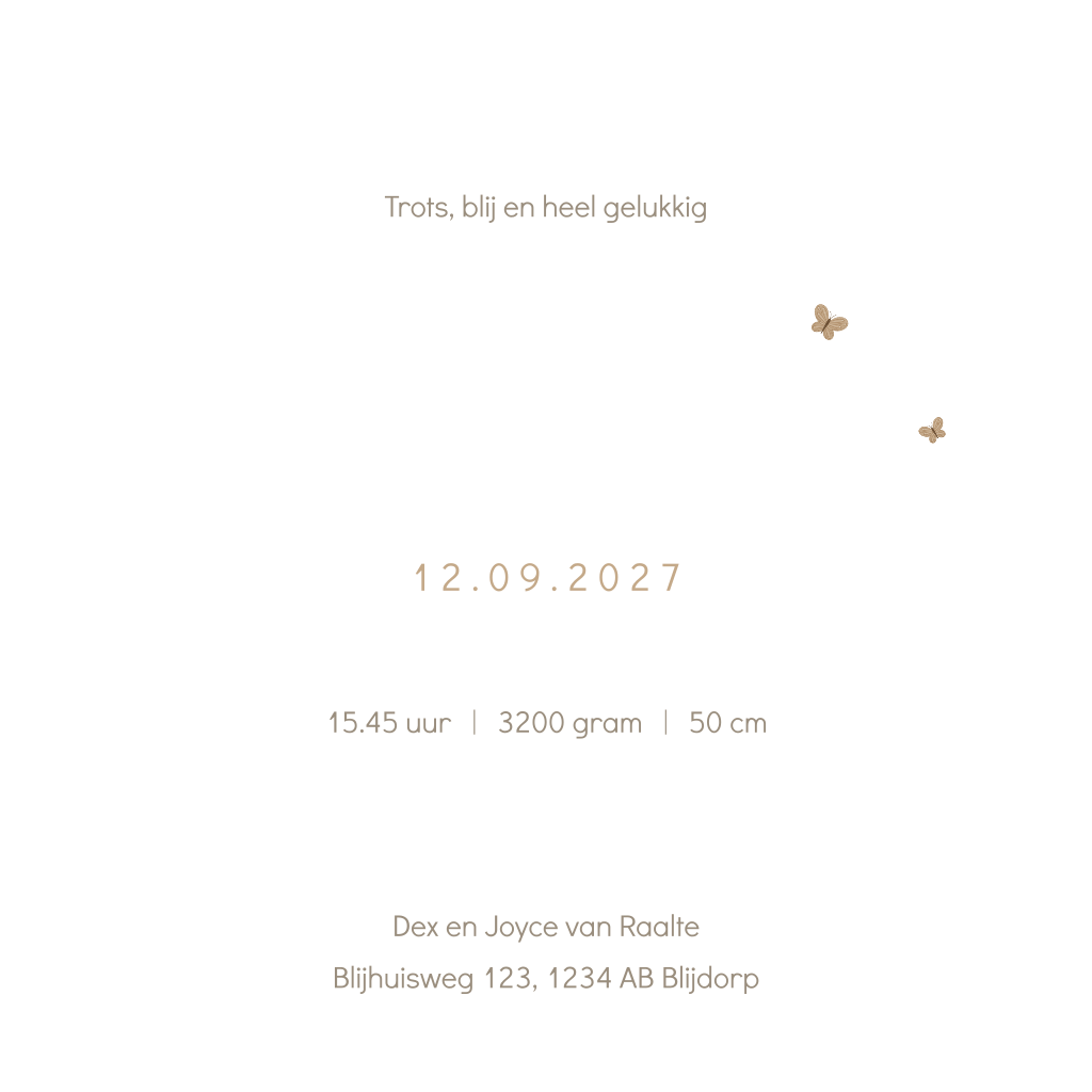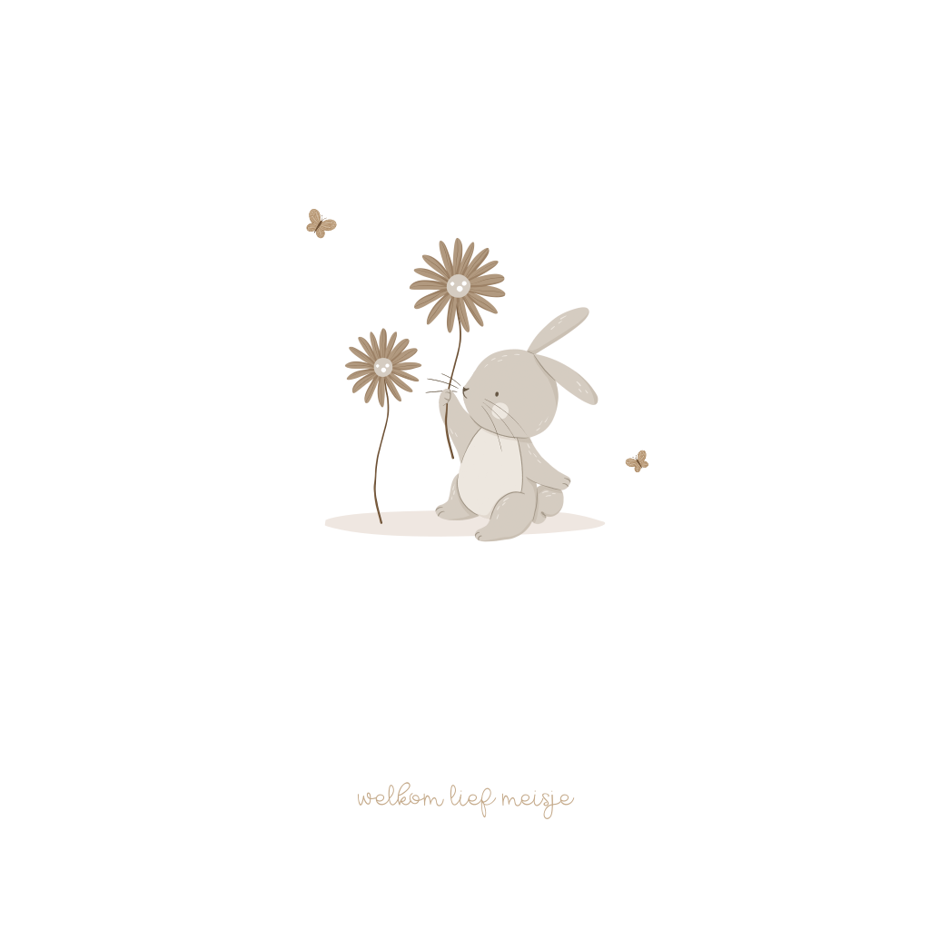Op dit geboortekaartje voor een meisje zie je een lief konijntje met bloemetjes en vlindertjes. Het kaartjes is overwegend rustig en wit met neutrale bruine kleuren. De goudfolie geeft een luxe touch aan dit rustige lieve geboortekaartje Lieke. Pas dit geboortekaartje geheel naar eigen wens aan in de ontwerpmodule. Hulp nodig? Wij helpen je graag om het perfecte geboortekaartje voor je meisje te maken!