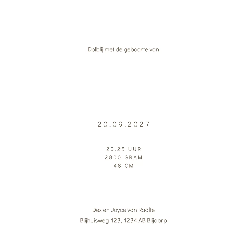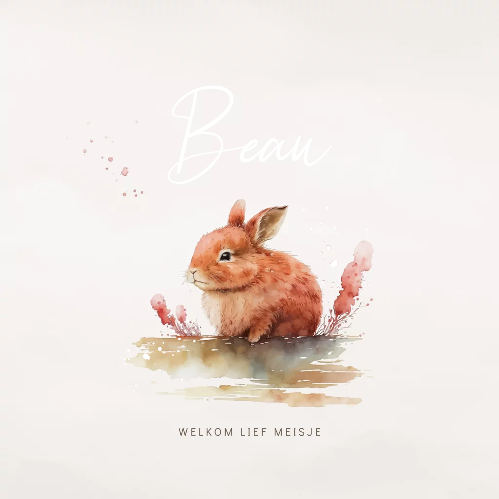 Dit geboortekaartje voor een meisje is precies wat je nodig hebt om de geboorte van je dochter aan te kondigen. Op dit geboortekaartje Beau staat een schattig aquarel konijntje. De babynaam wordt gedrukt in écht roséfolie. Dit geeft een luxe afwerking aan dit meisjeskaartje. De kaart is geheel aan te passen in de online ontwerptool. Hulp nodig? Wij helpen je graag!