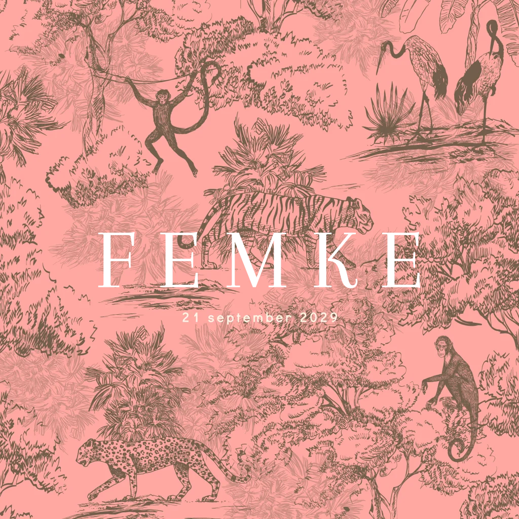 Prachtig luxe geboortekaartje voor een meisje geïnspireerd op het geboortekaartje van Esther Vedder. Dit geboortekaartje Paris heeft op de achtergrond de leuke print 'pink jungle'. Dubbelzijdig goudfolie maakt dit kaartje helemaal af en extra speciaal! De kleur van de foliedruk pas je heel makkelijk zelf aan in onze editor.