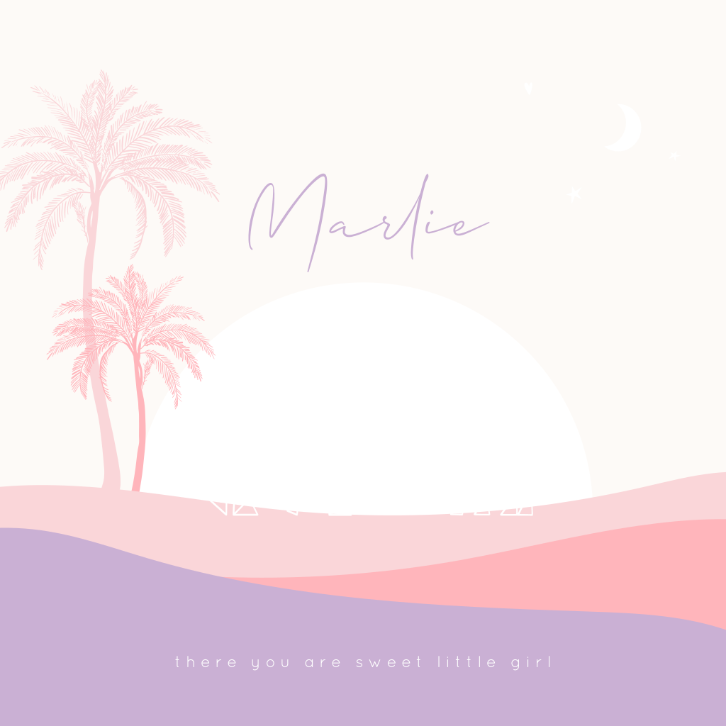 Schitterend geboortekaartje voor een meisje. Op dit kaartje met afgeronde hoeken zie je een olifant met haar baby olifantje in geometrische lijnen, in een glooiend landschap voor een ondergaande zon. Op dit geboortekaartje Marlie elementen in goudfolie, wat dit kaartje super exclusief maakt! De palmbomen, maan en sterren maken het jungle kaartje voor jullie dochter compleet.