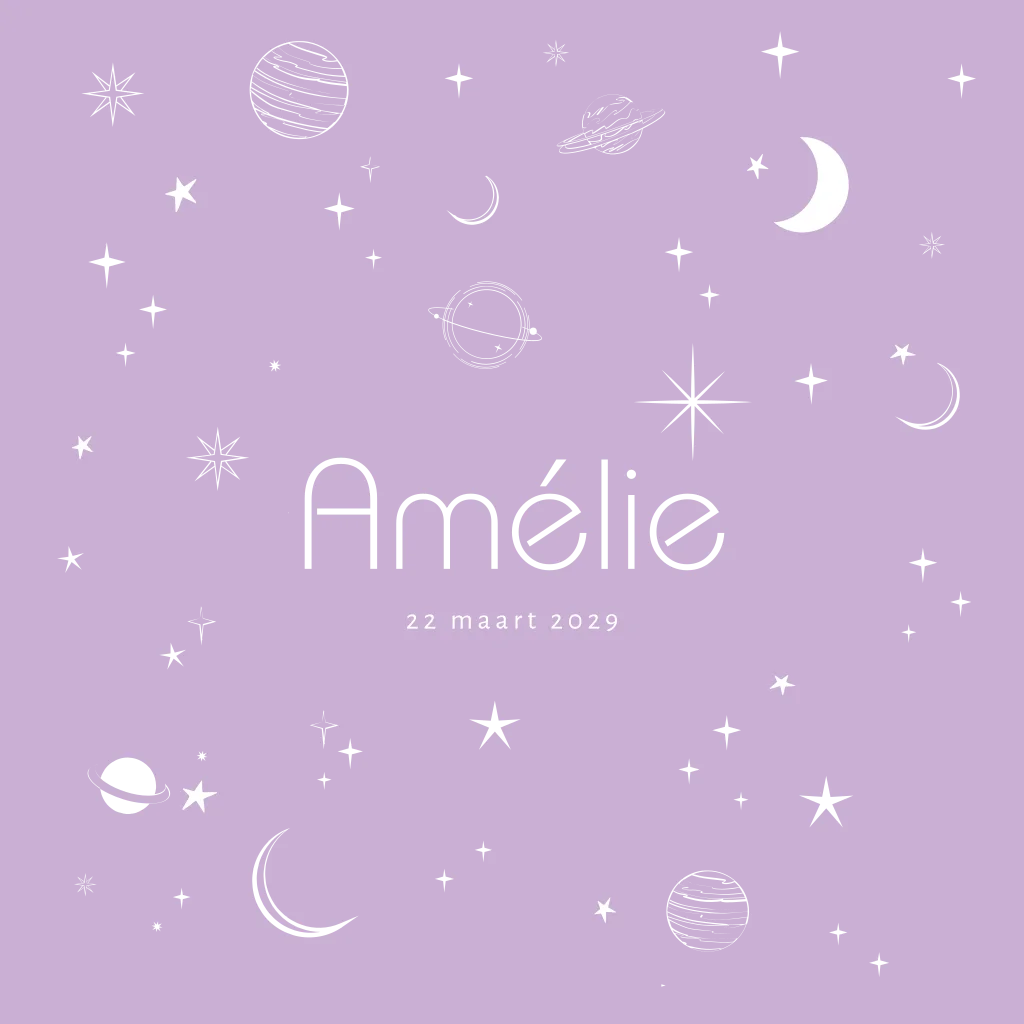 Ben je op zoek naar een uniek geboortekaartje voor je kleine meisje? Bekijk dan eens ons ruimtelijke geboortekaartje Amélie! Deze kaart is voorzien van echt holografisch folie, helemaal passend bij het magische heelal. Op deze kaart met afgeronde hoeken vind je planeten, de maan en sterren. Je kunt (folie)kleuren, lettertypes en teksten eenvoudig aanpassen in onze editor. Kom je er niet uit? We helpen je graag!
