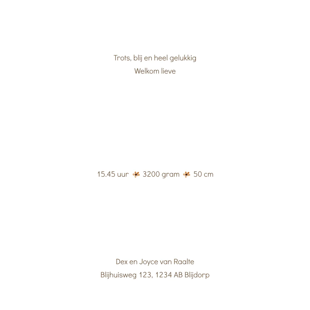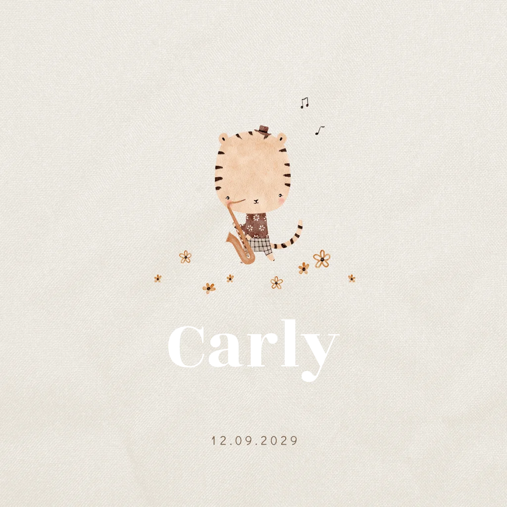 Ben je op zoek naar een bijzonder kaartje voor een geboorte? Dan is dit kaartje van Carly echt iets voor jou! Dit kaartje is lief en heeft mooie natuurlijke tinten. Op dit meisjes geboortekaartje een lief tijgertje die de saxofoon bespeelt. Op de achtergrond muzieknootjes met bloemen. De kaart heeft ronde hoeken wat een speels effect geeft. Het kaartje is voorzien van goudfolie en heeft een bijzondere sluitzegel met muzieknootjes.