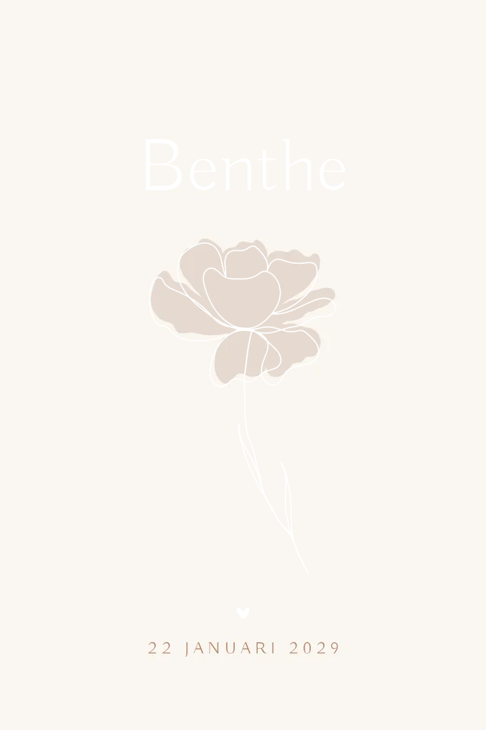 Uniek geboortekaartje voor een meisje met een geboortebloem. Dit babykaartje Benthe heeft een rustige uitstraling door de neutrale kleuren. De anjer bloem is passend bij de geboortemaand januari maar kan natuurlijk ook op zichzelf gebruikt worden. Over de bloem staat een prachtige lijntekening in echt goudfolie. Dit geeft een luxe uitstraling aan dit rustige en neutrale geboortekaartje. Pas de geboortebloem, kleuren en teksten gemakkelijk aan in de editor.