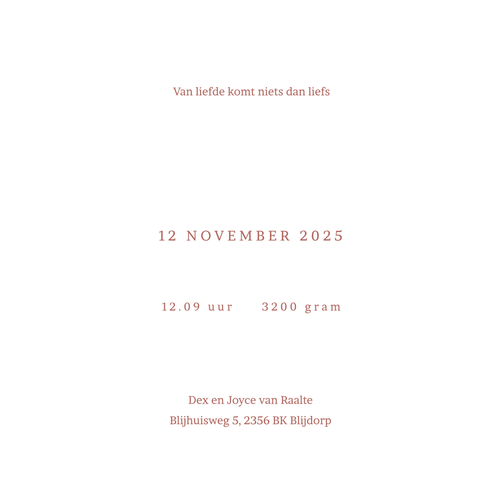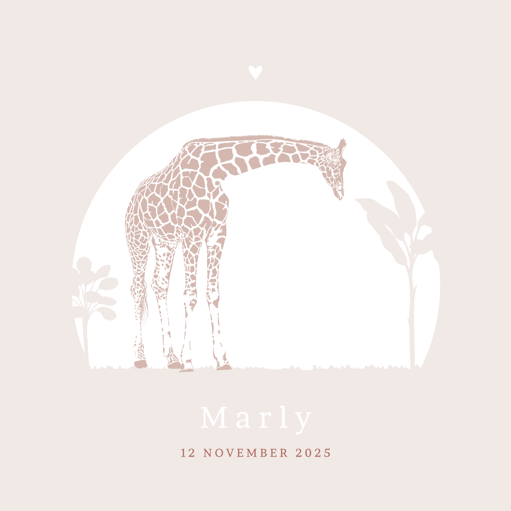 Jungle silhouet geboortekaartje voor een dochter in zachte roze en beige tinten. Op dit babykaartje Marly een giraffe die boven een kindje staat. Extra uniek aan dit kaartje is de foliedruk. Het silhouetje van het meisje, de naam en hartjes worden gedrukt in écht roséfolie, wat dit babykaartje een luxe uitstraling geeft. Wil je liever andere kleuren, dan kun je dit aanpassen in de editor. Ook mogelijk met een ander silhouet of voor een andere gezinssamenstelling.