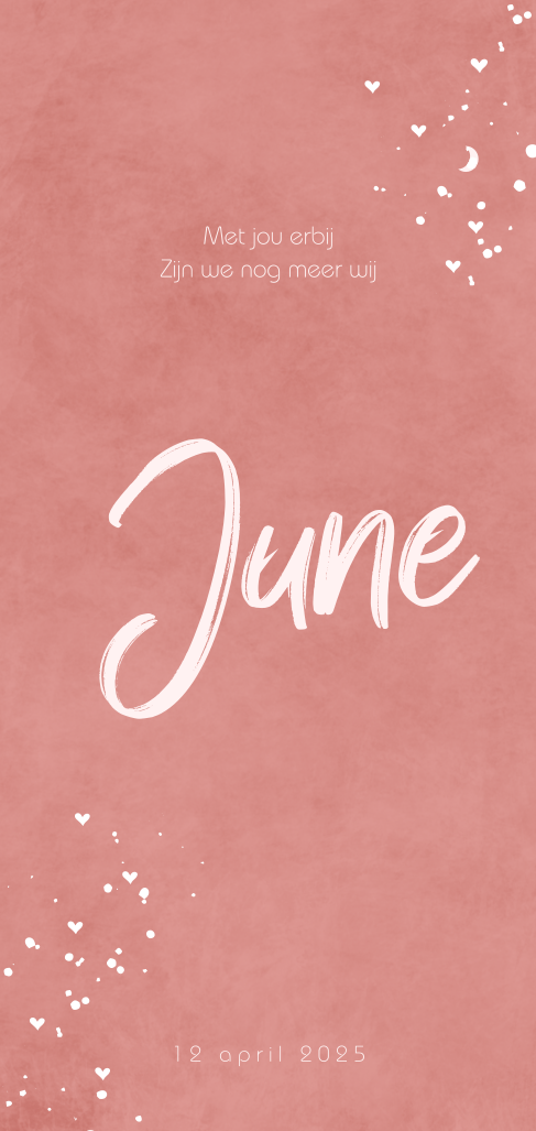 Rondhoek geboortekaartje voor een meisje met kleine hartjes en stipjes op een velvet look achtergrond. Dit kaartje June heeft een basic design, maar doordat de hartjes worden gedrukt in écht goudfolie krijgt dit kaartje een luxe uitstraling. De ronde hoeken maken het helemaal af. Teksten en kleuren kun je aanpassen in de editor. De kleur van de folie kun je wijzigen naar koperfolie, zilverfolie zwartfolie, of roséfolie.