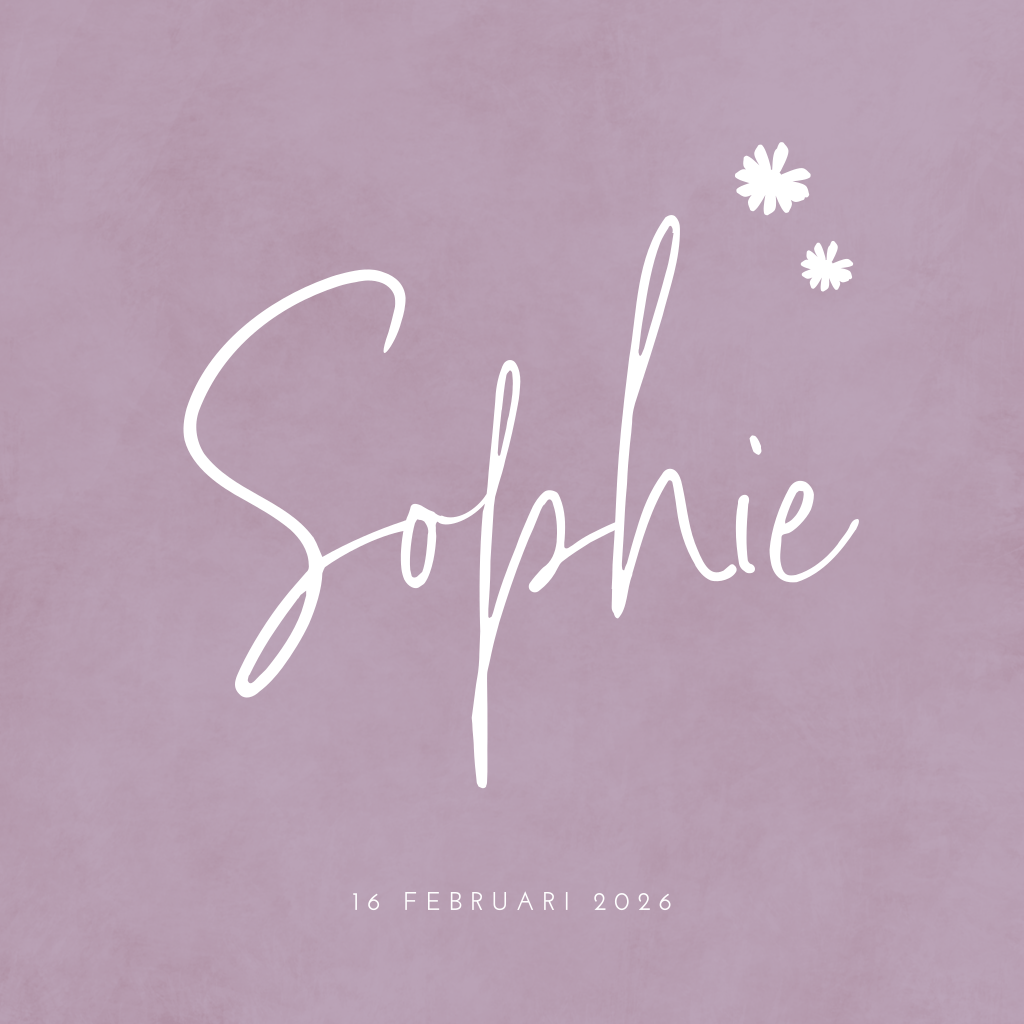 Hip geboortekaartje voor een meisje met een paarse velvetlook achtergrond en madeliefjes. De ronde hoeken en goudfolie maken dit kaartje Sophie extra speciaal. Pas de teksten, kleuren en lettertypes naar je eigen smaak aan in de editor.