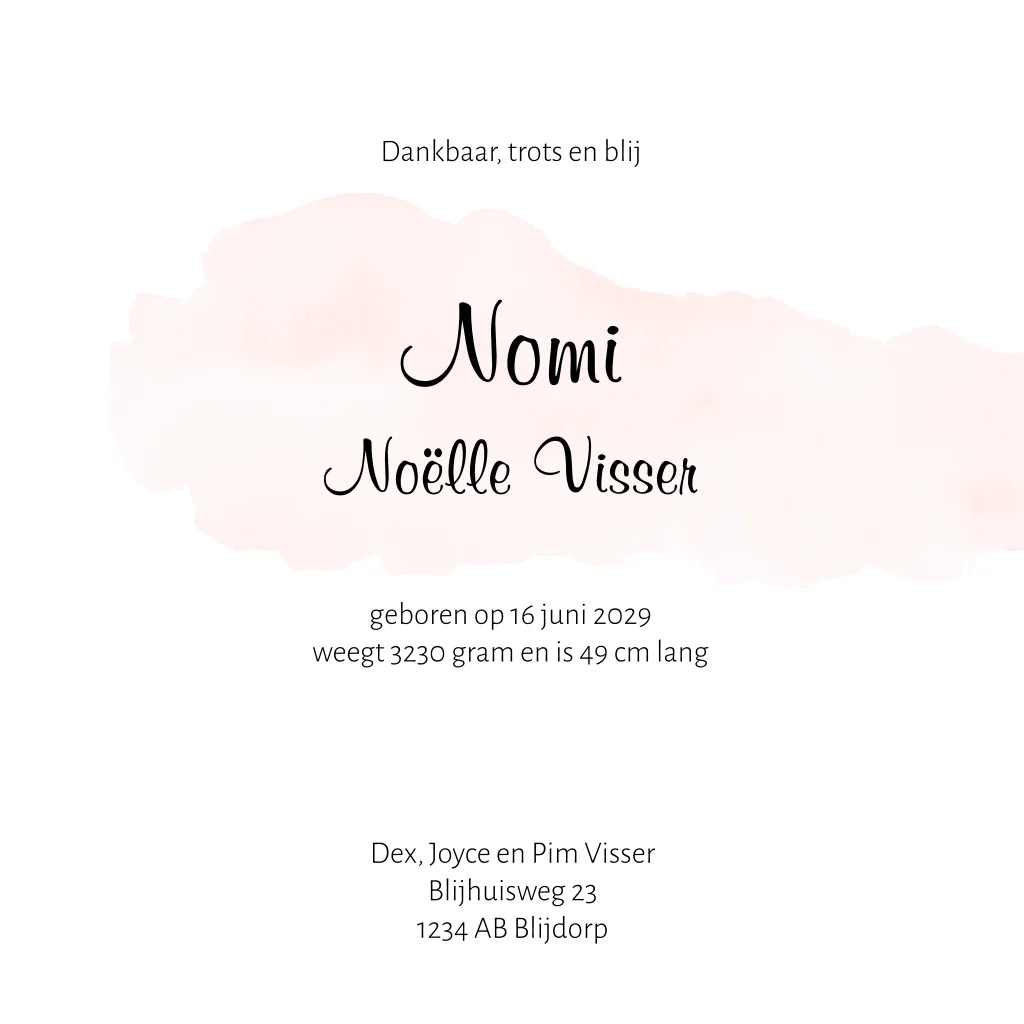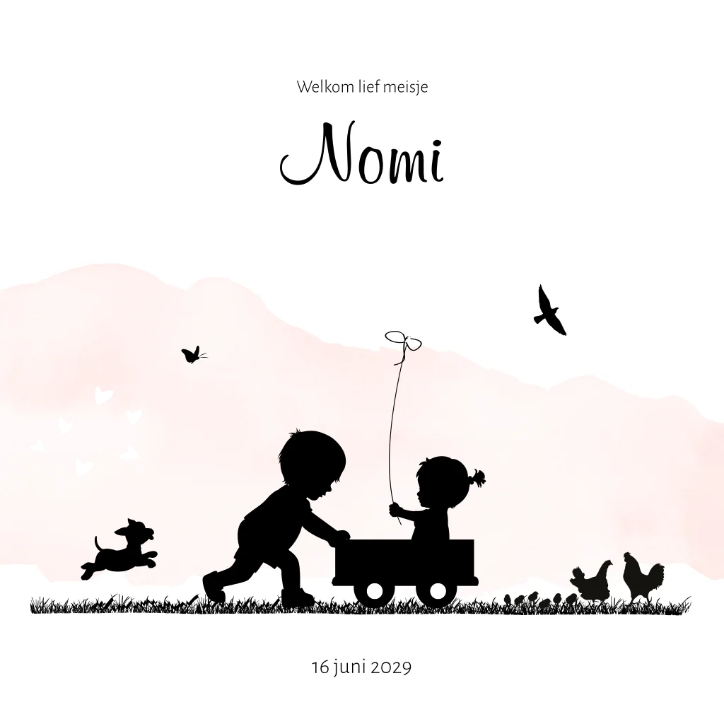 Lief goudfolie geboortekaartje met silhouet voor een zusje. Op dit babykaartje Nomi staat een grote broer samen met zijn kleine zusje. Het meisje zit in een karretje met een ballon in haar hand. Op de achtergrond een aquarel in de kleur roze. De hartjes en de ballon worden gedrukt in echt goudfolie. Dat maakt dit kaartje extra speciaal. Dit silhouet kaartje is gemakkelijk aan te passen en ook mogelijk in een andere samenstelling. Ook mogelijk met koperfolie, zilverfolie of roséfolie.