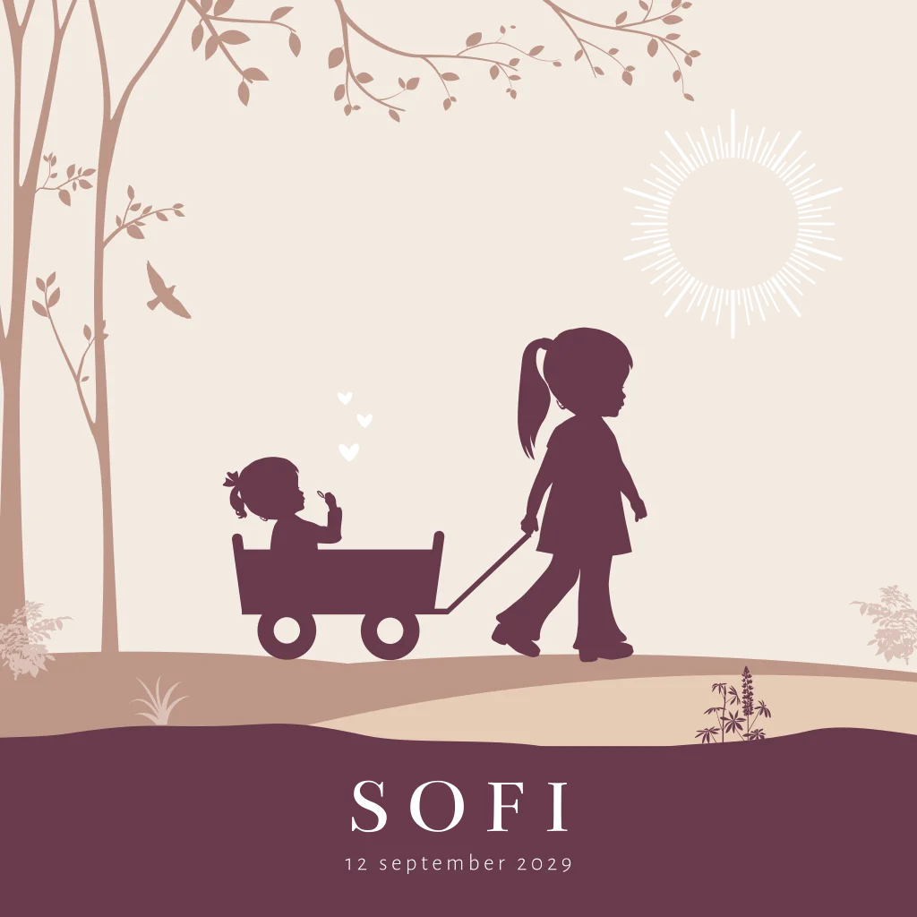 Grote zus met klein zusje in bolderkar silhouet kaartje