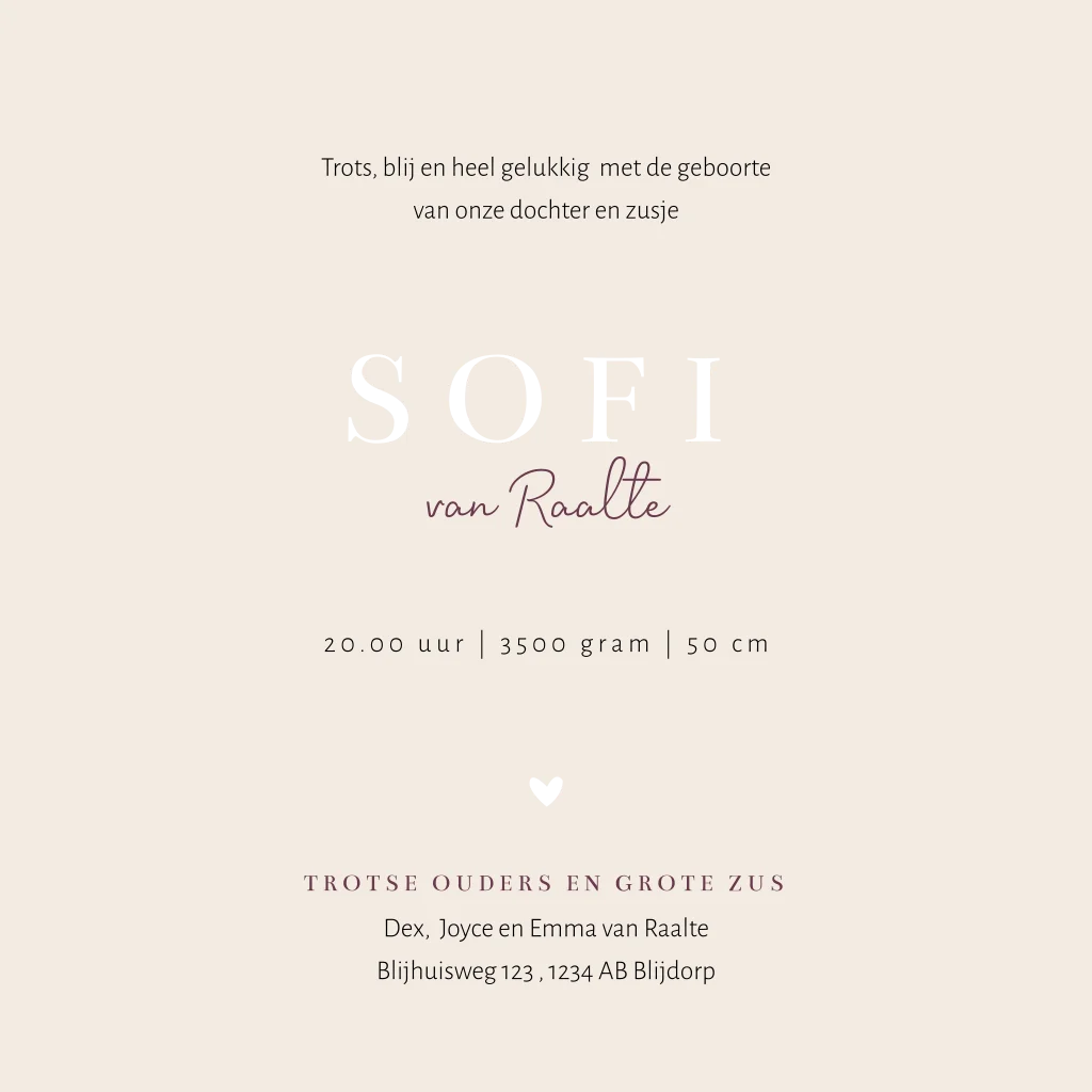 Silhouet geboortekaartje in trendy kleuren voor een tweede dochter. Op dit meisjeskaartje Sofi zie je een grote zus met een bolderkar waarin haar baby zusje zit. Het kleine meisje blaast hartjes door een bellenblaas. De babynaam, de kleine hartjes en het stralende zonnetje worden gedrukt in echt goudfolie. Teksten, kleuren en silhouetten kun je aanpassen in de editor. Dit geboortekaartje is ook mogelijk voor een andere gezinssamenstelling.