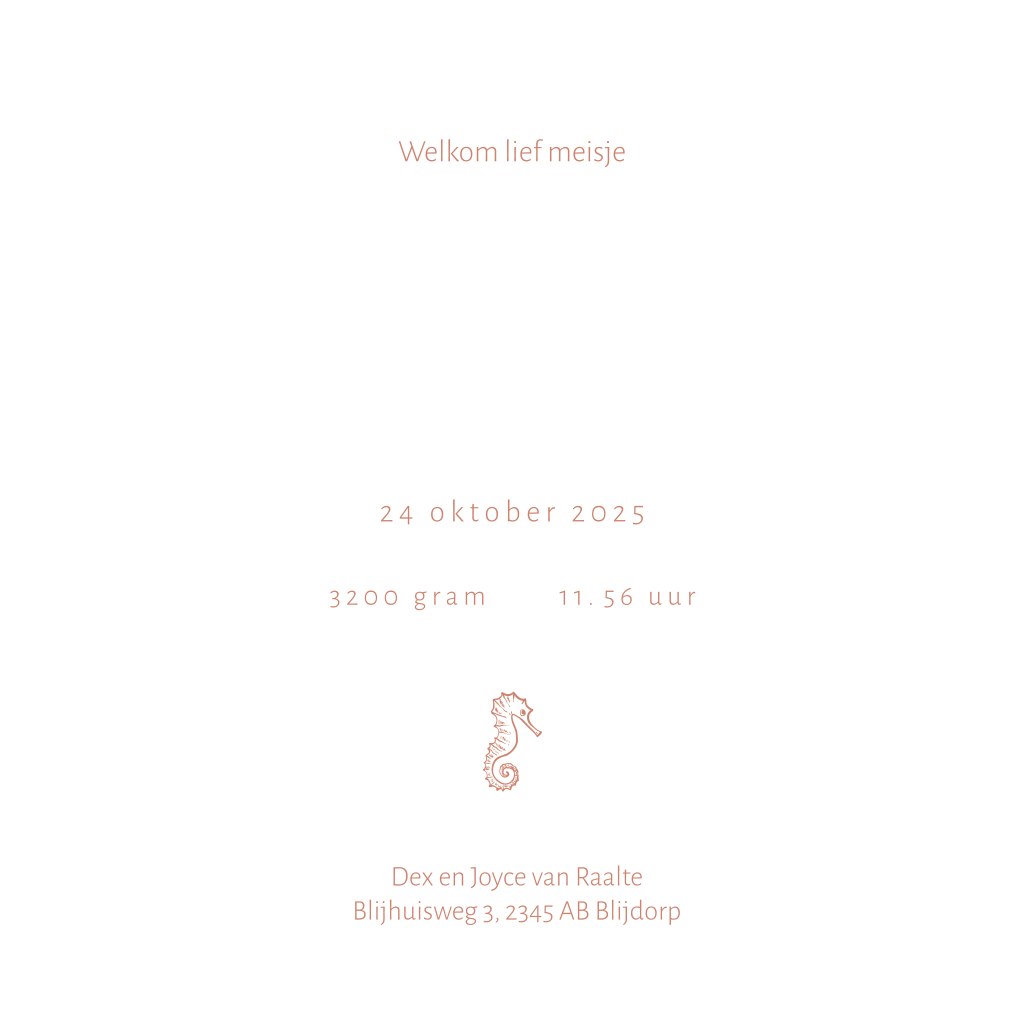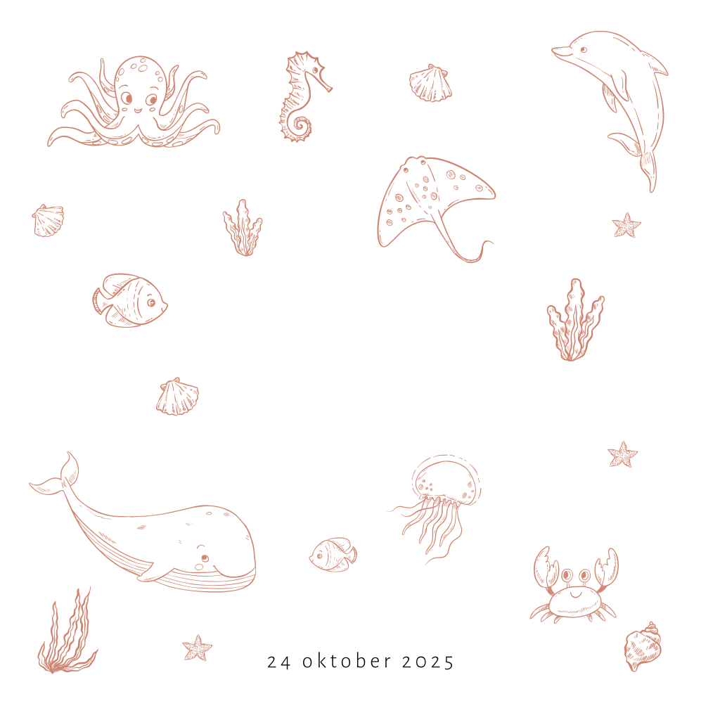 Meisjes geboortekaartje met vrolijke illustraties van dieren uit de oceaan, waaronder een walvis, dolfijn, inktvis en zeepaardje. Dit kaartje Alyke in onderwaterwereld thema krijgt een luxe uitstraling omdat de babynaam wordt gedrukt in echt goudfolie. De folie heeft een mooie glans en is een mooie combinatie met de zeedieren in trendkleur terra. De kleur van de folie kun je aanpassen naar zilverfolie, koperfolie, roséfolie of zwartfolie.