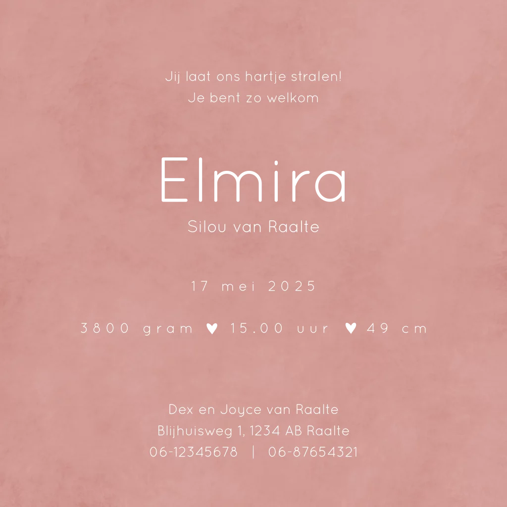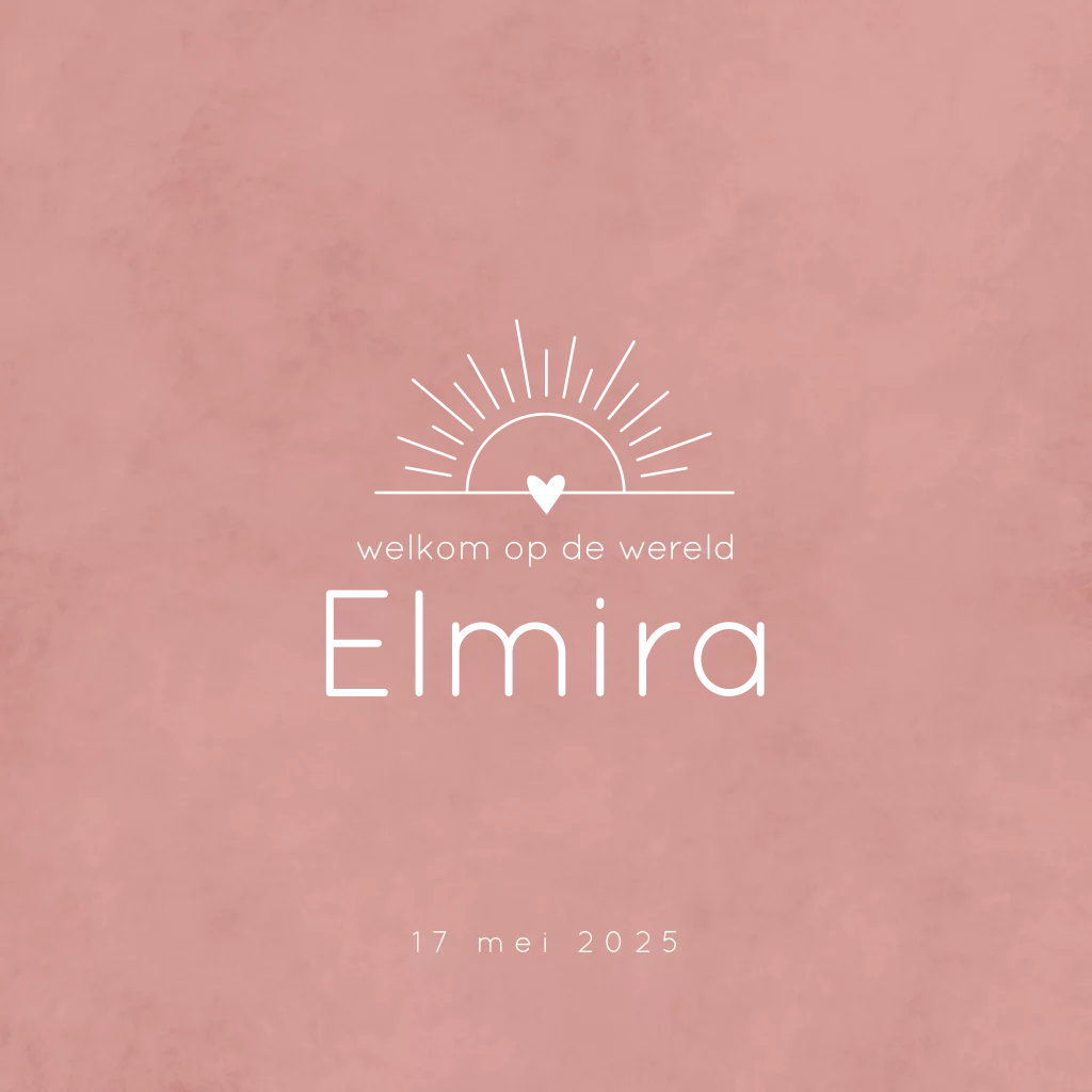 Lief islamitisch geboortekaartje voor een meisje met hartje in een ondergaande zon voor een trendy, roze betonlook achtergrond. De goudkleurige elementen op dit kaartje Elmira worden gedrukt in écht goudolie. Door de folie krijgt dit kaartje voor een dochter, jullie eigen zonnestraaltje, een luxe uitstraling.