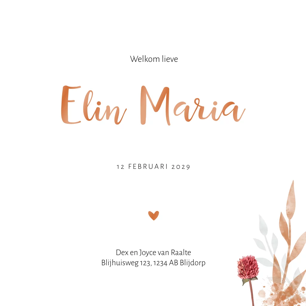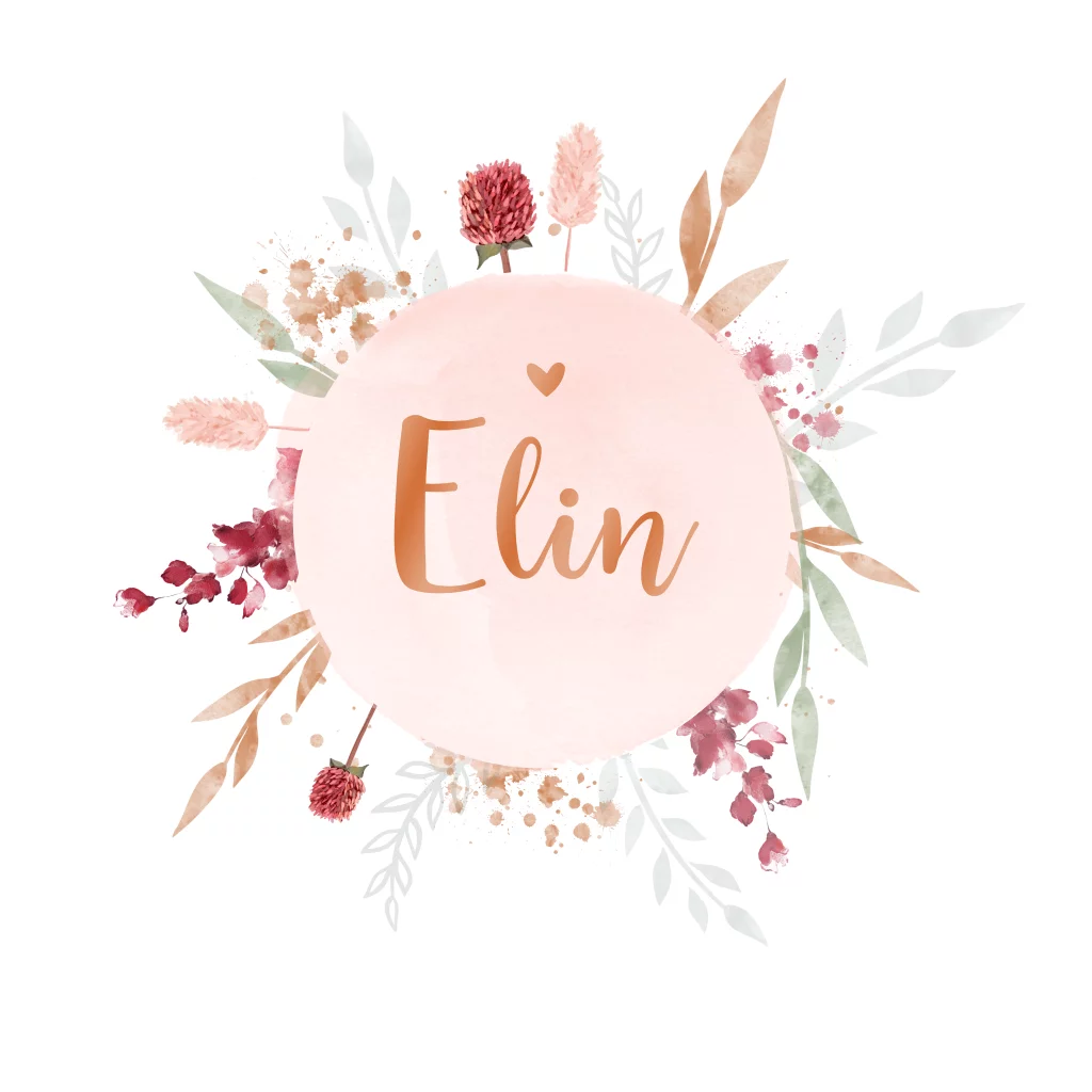 Lief geboortekaartje voor een meisje met droogbloemen en aquarel. De babynaam Elin en het hartje worden gedrukt in hoogglans. Dit geeft je kaartje een extra luxe uitstraling. Teksten en kleuren zijn aan te passen in de editor. Ook mogelijk met goudfolie, zilverfolie of roséfolie.