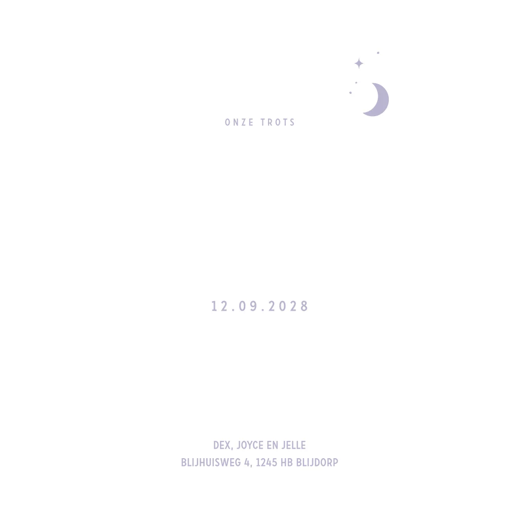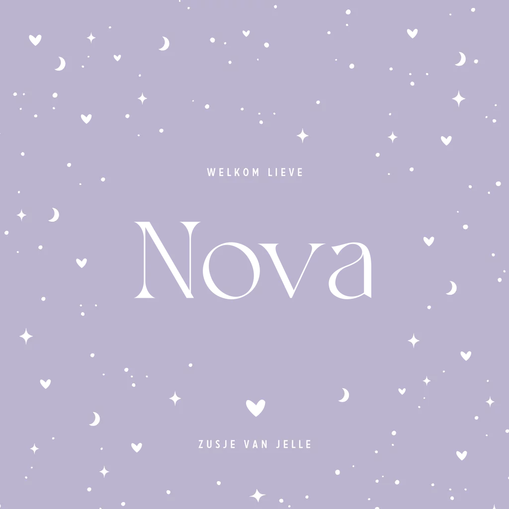 Hip folie geboortekaartje voor een dochter. Dit kaartje Nova heeft een trendy lila achtergrondkleur met kleine maantjes, sterretjes en hartjes. De babynaam en de kleine hartjes worden gedrukt in écht goudfolie. De folie geeft een mooie glans en geeft een extra luxe uitstraling aan je kaartje. De teksten en kleuren zijn aan te passen in de editor.