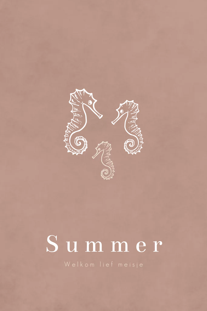Meisjes geboortekaartje met one line illustraties van schattige zeepaardjes. Dit dieren kaartje Summer heeft een terra roze velvet / velours look achtergrond. De teksten en de lijntekening in het wit en goudfolie komen hierop mooi naar voren. Pas dit lieve babykaartje voor een dochter naar je eigen smaak aan in de editor.