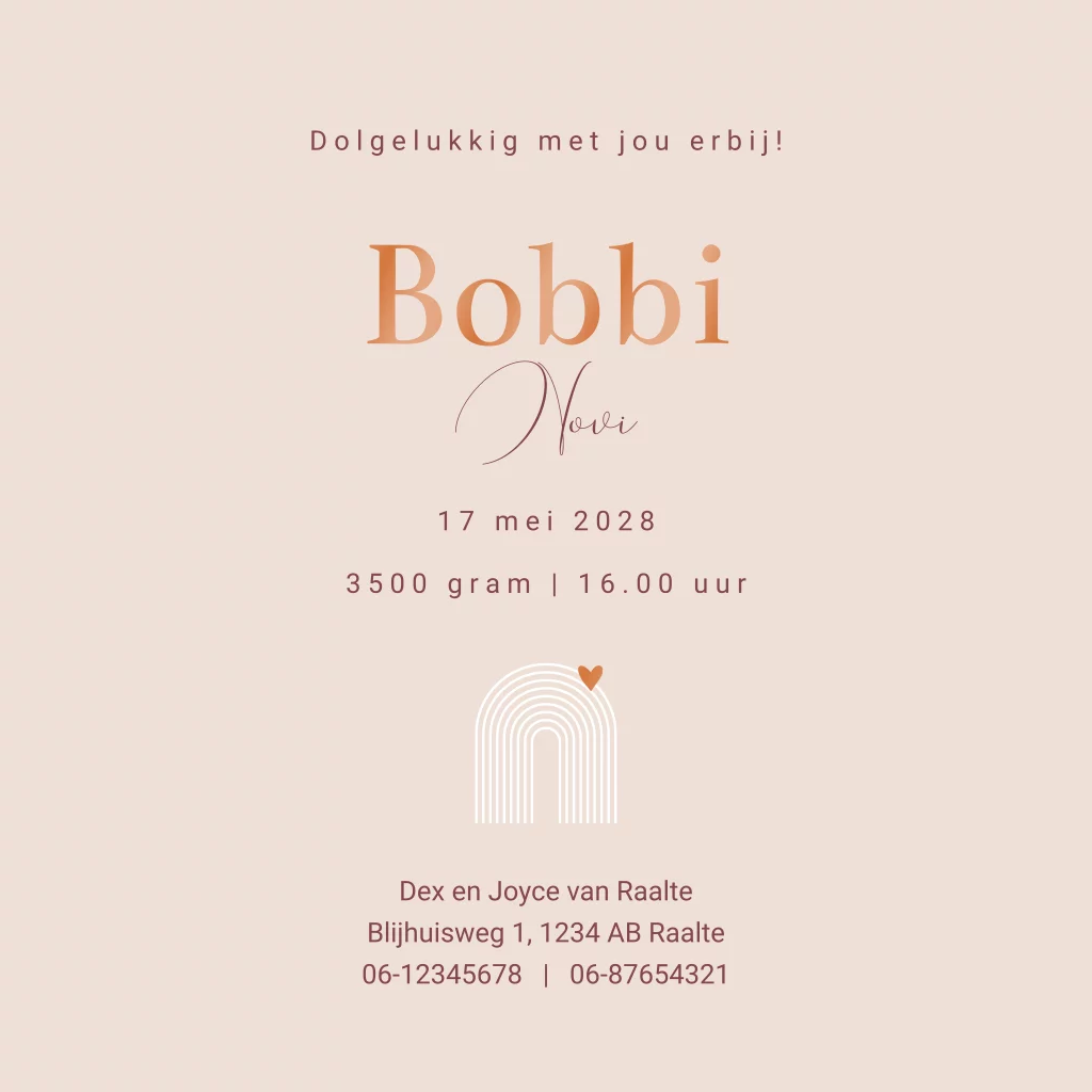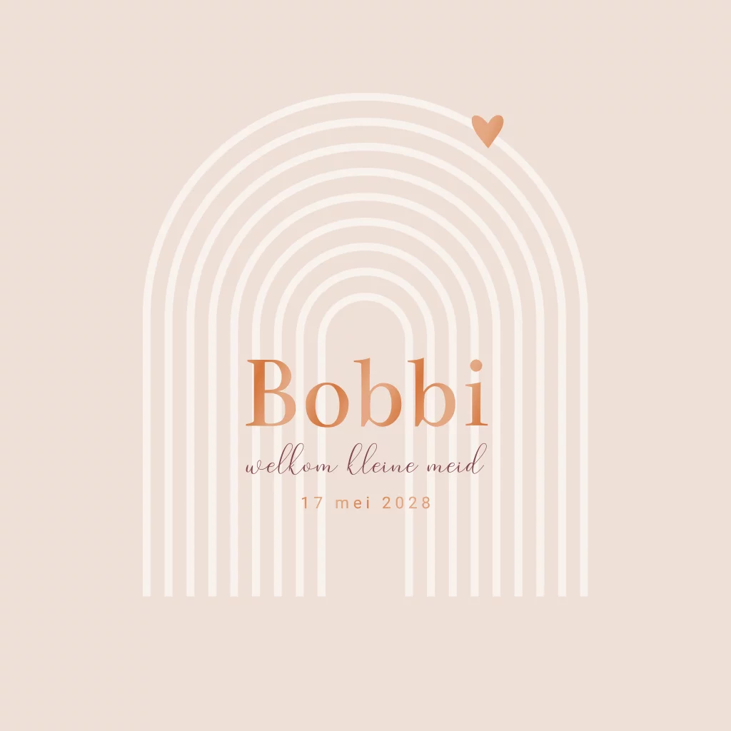 Geboortekaartje Bobbi voor een dochter met regenboog en de lieve tekst "Welkom kleine meid". De hoogglans elementen op dit babykaartje voor een dochter worden in hoogglans gedrukt, wat een hele luxe uitstraling geeft! Verder op deze kaart een schattig klein hartje. Teksten en kleuren pas je eenvoudig aan in de editor.