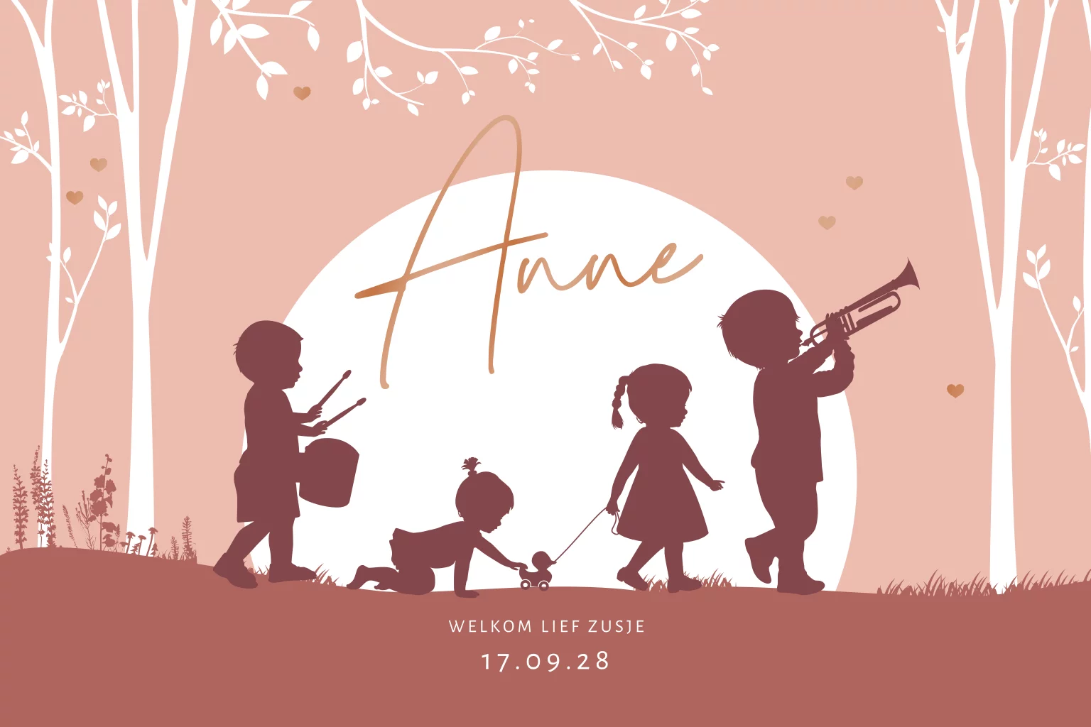 Het is feest, want er is een vierde kindje geboren! Op dit silhouet geboortekaartje voor een zusje een vrolijke parade met muziekinstrumenten. Een grote broer loopt voorop met een trompet en achteraan loopt een grote broer met een trommel. Een grote zus loopt met een speelgoed eendje en het kleine baby zusje kruipt er achteraan. Een vrolijk kaartje met een muzikaal gezelschap. De babynaam en de kleine hartjes worden gedrukt in écht hoogglans, dit geeft het kaartje een extra luxe uitstraling. Erg geschikt voor een groot gezin of een samengesteld gezin. Dit kaartje Anne is ook te gebruiken voor een andere gezinssamenstelling. Ook mogelijk met goudfolie, zilverfolie, roséfolie of zwartfolie.