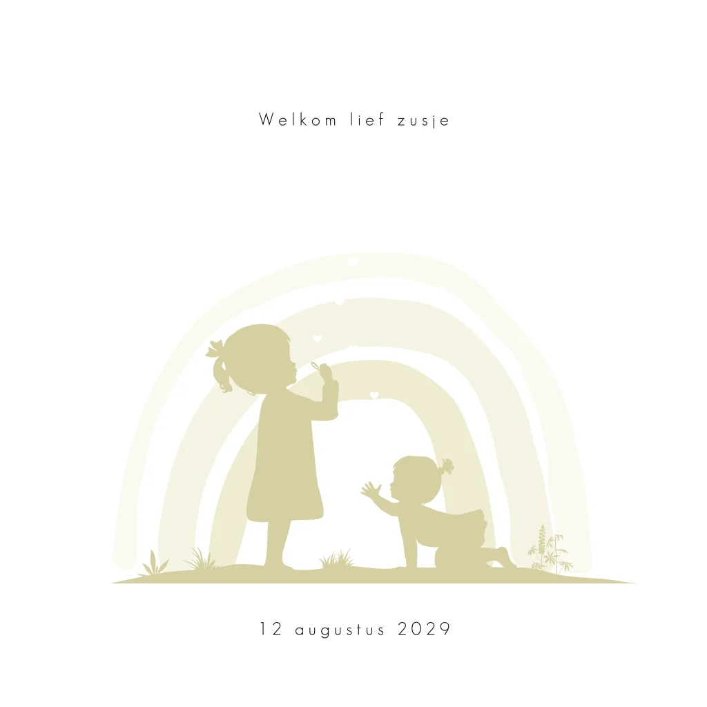 Silhouet geboortekaartje voor een meisje met foliedruk. Een grote zus blaast hartjes door een bellenblaas en een klein baby zusje zit op de knietjes. De babynaam en de hartjes worden gedrukt in echt goudfolie. Folie heeft een mooie glans en geeft een luxe uitstraling. Op de achtergrond een regenboog. Op dit geboortekaartje Loua is gebruikt gemaakt van trendy kleuren. Je kunt de teksten, kleuren en lettertypes naar je eigen smaak aanpassen. Ook mogelijk met roséfolie, zilverfolie of holografischfolie.