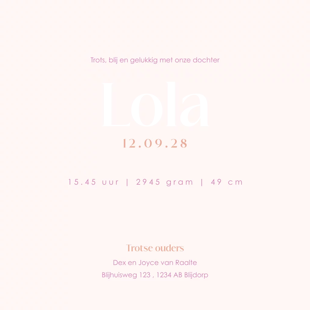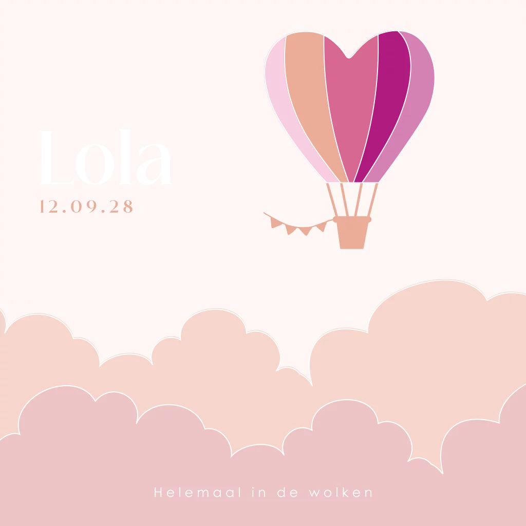 Dit prachtige geboortekaartje Lola met een hartjes luchtballon is een unieke manier om de geboorte van jullie dochtertje aan te kondigen. Dit geboortekaartje heeft een lieve uitstraling door alle roze tinten. Verschillende elementen zijn in goudfolie ontworpen. Goudfolie geeft dit kaartje een extra luxe uitstraling zowel aan de binnenkant als aan de buitenkant van de kaart. In de editor kun je dit geboortekaartje naar eigen wens aanpassen. Maak de kaart helemaal af met een bijpassende sluitzegel en envelop.