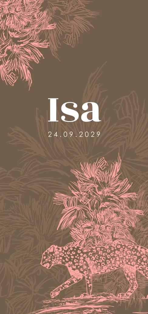 Prachtige luxe en langwerpige kaart met afgeronde hoeken, geïnspireerd door het geboortekaartje van Esther Vedder. Dit geboortekaartje Isa heeft een bruine achtergrond maar roze jungle dieren zoals een luipaard en jungle takken. De goudfolie maakt het helemaal af!