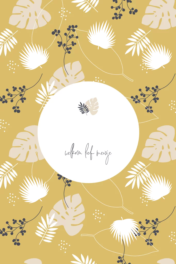 Meisjes geboortekaartje in een trendy kleur geel en op de achtergrond een patroon van verschillende tropische bladeren. De babynaam en enkele blaadjes worden gedrukt in écht goudfolie. De folie heeft een mooie glans en geeft dit kaartje Cato een extra luxe uitstraling. Extra speciaal aan dit kaartje zijn de ronde hoeken.