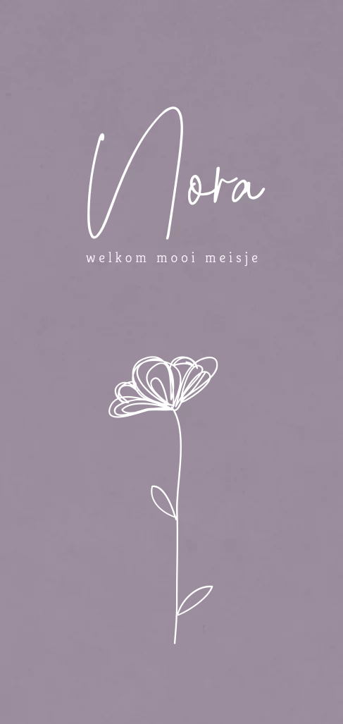 Een meisjes geboortekaartje met ronde hoeken en een klaproos one line tekening. Extra speciaal aan dit kaartje Nora, is dat de naam en bloem worden gedrukt in écht roséfolie. De folie heeft een mooie glans en geeft de kaart een exclusieve uitstraling. Verder is het een modern en basic kaartje met en prachtige paarse achtergrondkleur. Wat een warme uitstraling geeft. De teksten en kleuren kun je aanpassen in de editor. De kleur van de folie kun je wijzigen naar koperfolie, zilverfolie, zwartfolie of goudfolie.