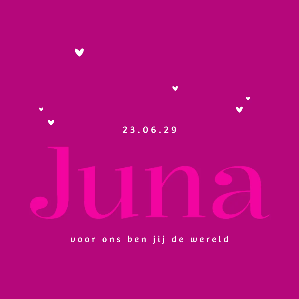 Basic geboortekaartje voor een meisje met foliedruk en kleine hartjes. Dit kaartje Juna heeft een basic design, maar doordat de hartjes gedrukt worden in écht goudfolie, krijgt de kaart een luxe uitstraling. Ook mogelijk met roséfolie, zilverfolie of koperfolie.