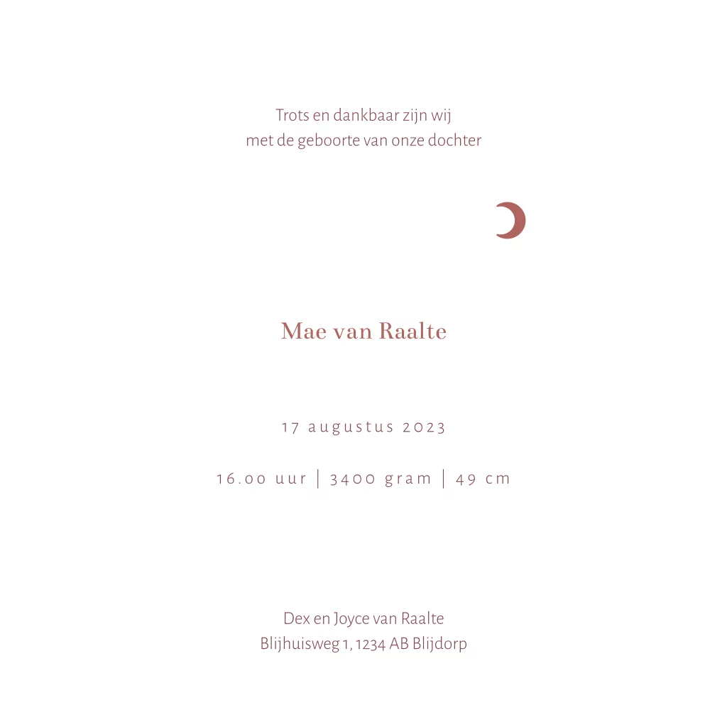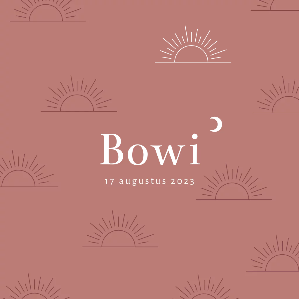 Geboortekaartje voor een meisje met meerdere ondergaande zonnetjes in verschillende kleuren voor een trendy terra roze achtergrond. Op dit babykaartje Bowi een aantal elementen in roségoudfolie, wat het kaartje een super exclusieve uitstraling geeft! Dit kaartje voor een dochter is ook mogelijk in zwartfolie, koperfolie, zilverfolie of goudfolie. Een klein wit maantje bij de naam geeft een schattig effect.
