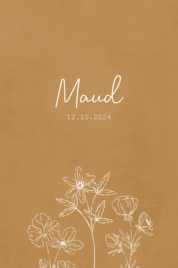 Geboortekaartje voor een meisje met de babynaam en getekende bloemen in écht roséfolie. Folie heeft een mooie glans en springt er helemaal uit in combinatie met de vintage achtergrond in trendy camel kleur. Dit babykaartje Maud kun je zelf bewerken in de editor. Pas de teksten en kleuren naar je eigen smaak aan. De kleur van de folie kun je ook makkelijk wijzigen naar goudfolie, koperfolie, zilverfolie of zwartfolie.