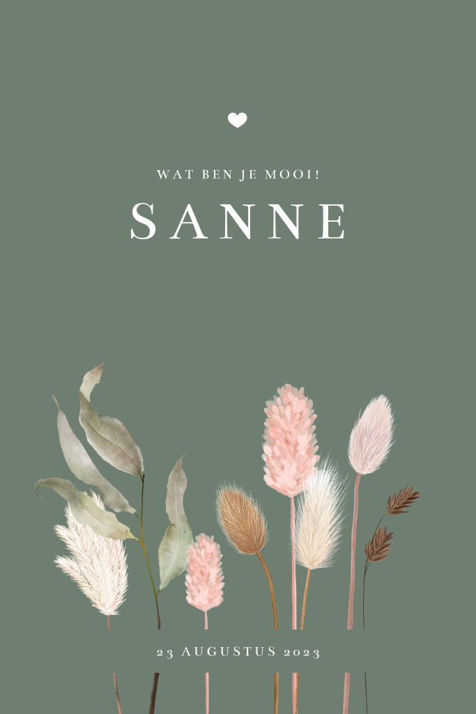 Hip geboortekaartje Sanne voor een meisje met trendy droogbloemen. De naam van de baby wordt gedrukt in echt roséfolie. Een mooie combinatie met de groene achtergrondkleur. Foliedruk geeft je kaart een exclusieve uitstraling. Ook mooi met goudfolie, koperfolie of zilverfolie. Dit is aan te passen in de editor.