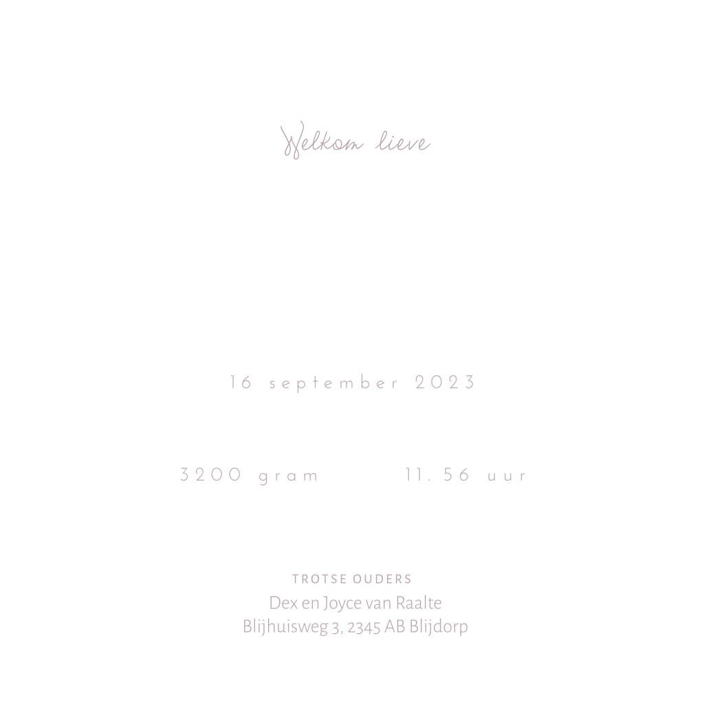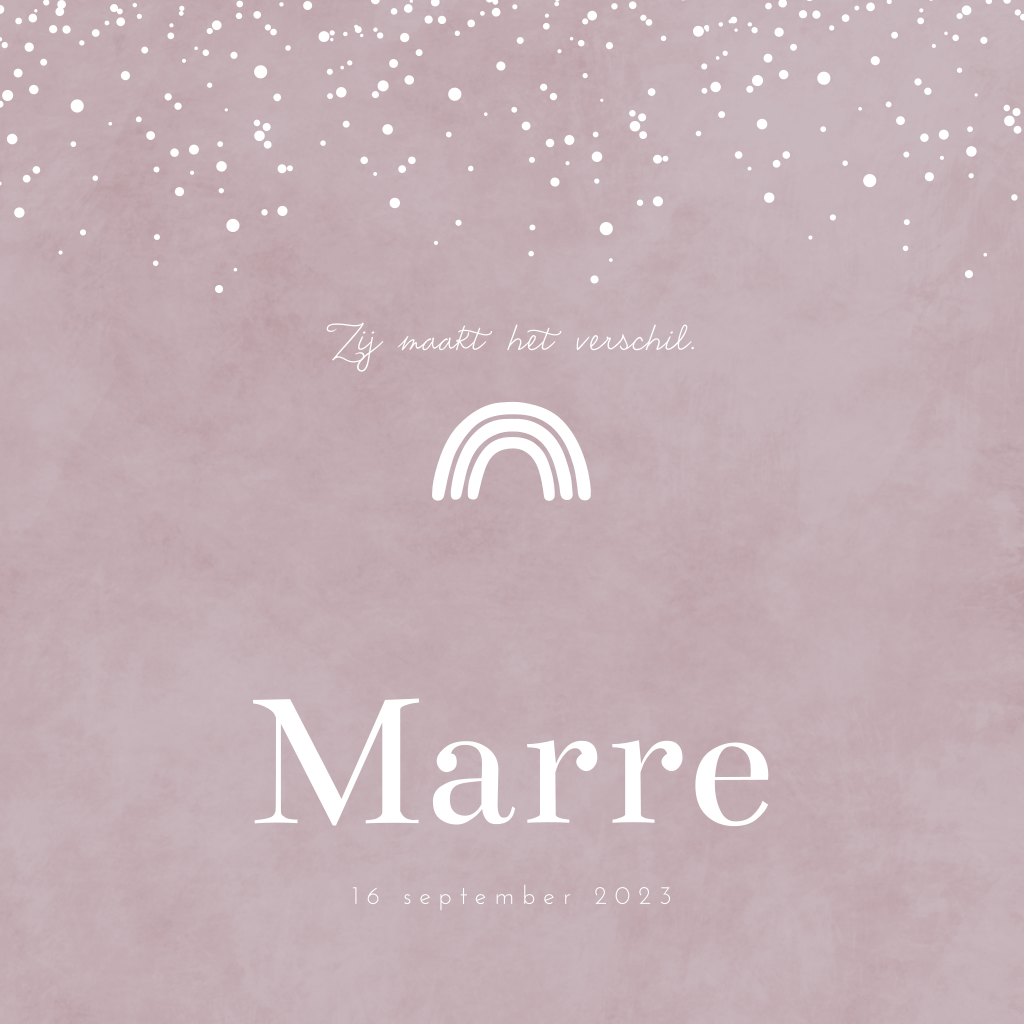 Hip geboortekaartje voor een dochter met de babynaam, een trendy regenboogje en kleine stipjes in écht rosefolie. Een mooie combinatie met de velvet / velours look op de achtergrond. Door de folie krijgt dit meisjeskaartje met de naam Marre een luxe uitstraling. In onze editor kun je de kleur van de folie makkelijk wijzigen naar koperfolie, zilverfolie, roséfolie of zwartfolie.