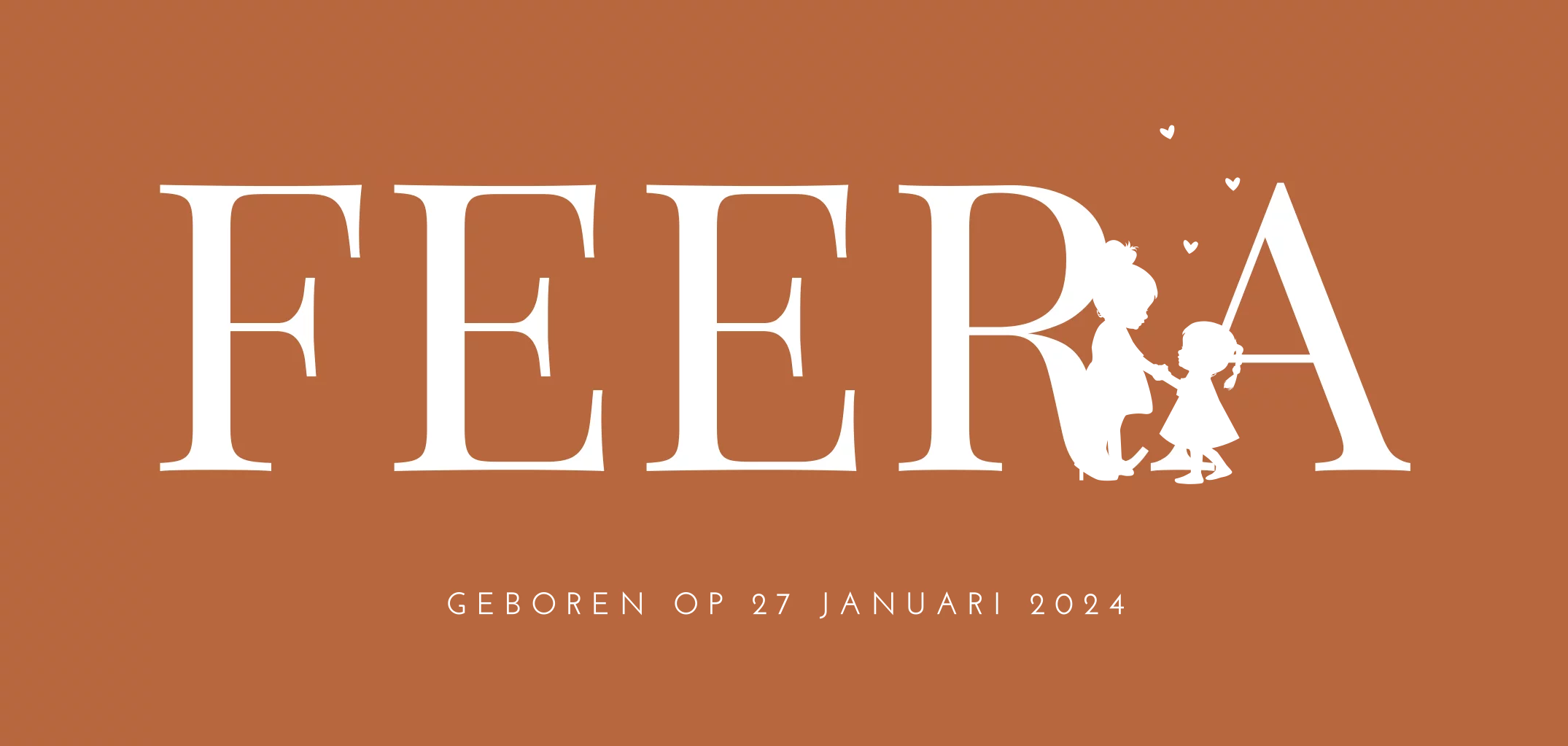 Basic silhouet geboortekaartje voor een tweede dochter met trendy kleuren en foliedruk. Op dit meisjeskaartje staat de babynaam Feera groot op de kaart in een strak lettertype met daarbij een silhouet van 2 zusjes. Het silhouet, de kleine hartjes en de geboortegegevens worden gedrukt in echt roséfolie. Dat geeft deze basic kaart een luxe uitstraling. De teksten en kleuren, evenals het silhouet, zijn aan te passen in de editor.