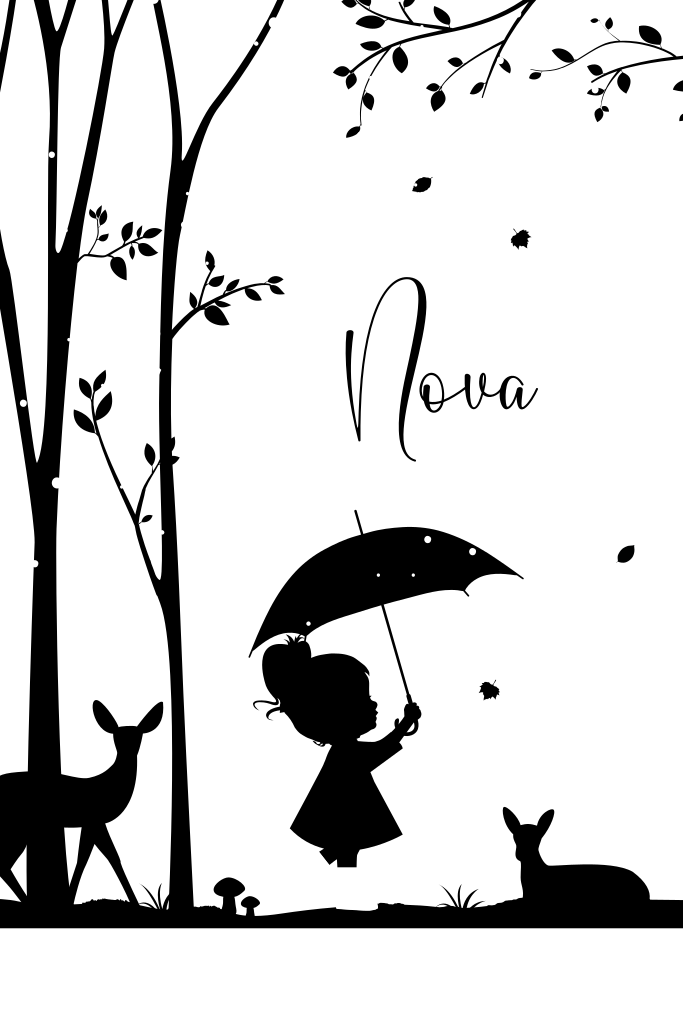 Herfst silhouet geboortekaartje van een meisje met paraplu en regen laarsjes. De rosé kleurige afbeeldingen op dit kaartje Nova, waaronder de laarsjes, de eekhoorn en de regen, worden gedrukt in écht roséfolie. Dit geeft je kaart een extra luxe uitstraling. Ook mogelijk met goudfolie, koperfolie of zilverfolie.