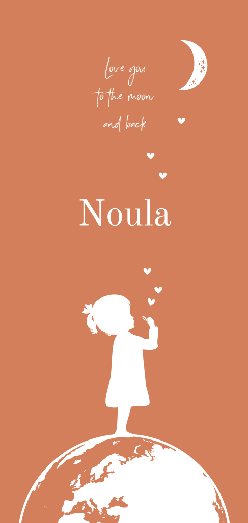 Hip foliekaartje voor een dochter met het silhouet van een meisje op een wereldbol. Het meisje blaast hartjes door een bellenblaas. Op dit geboortekaartje met de babynaam Noula worden het silhouet, de kleine hartjes en de maan gedrukt in écht roséfolie. Foliedruk zorgt voor een luxe uitstraling en maakt dit kaartje extra speciaal. Teksten en kleuren, evenals het silhouet, zijn aan te passen in de editor. Ook mogelijk met goudfolie, zilverfolie, koperfolie of zwartfolie.